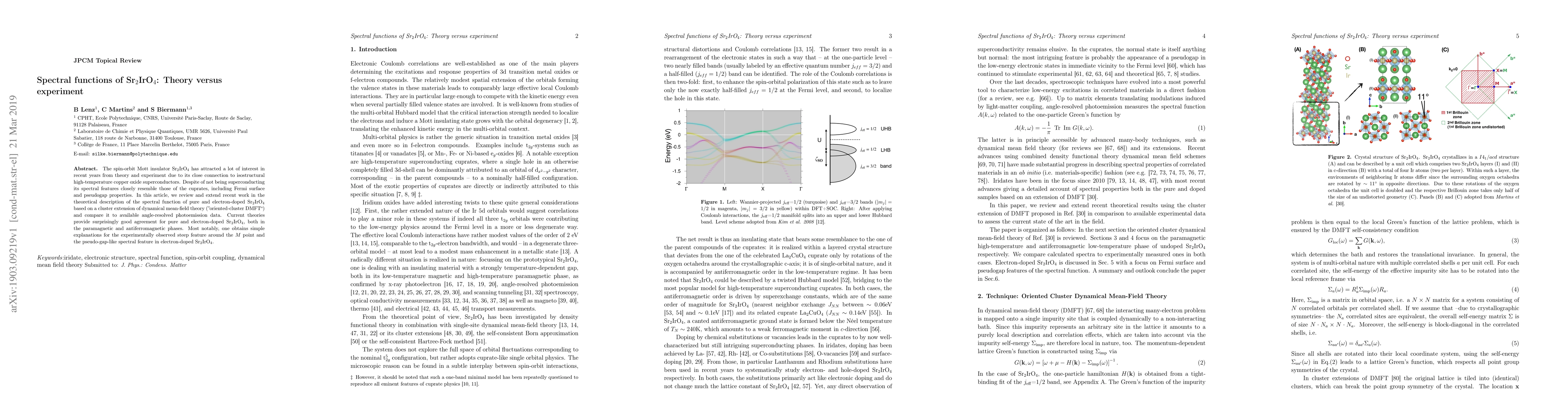 This paper reviews theoretical models for the spectral function of Sr${}_2$IrO${}_4$ using oriented-cluster DMFT and compares them to experimental data. The theoretical models show good agreement with the observed spectral features, including the steep feature around the $M$ point and pseudo-gap phenomena in electron-doped samples.