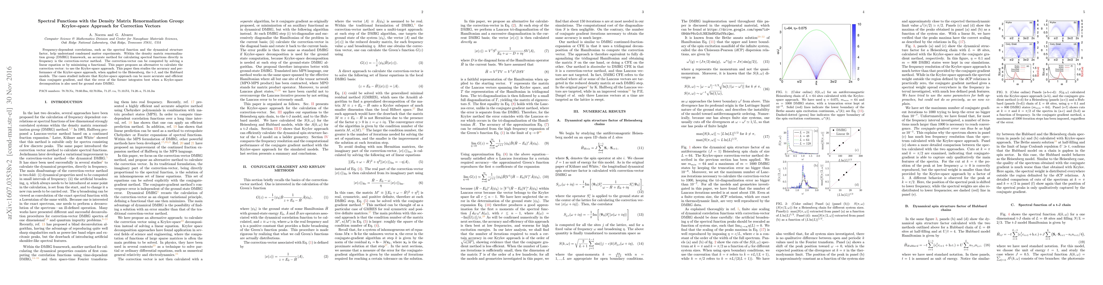 Frequency-dependent correlations, such as the spectral function and the dynamical structure factor, help understand condensed matter experiments. Within the density matrix renormalization group (DMRG) framework, an accurate method for calculating spectral functions directly in frequency is the correction-vector method. The correction-vector can be computed by solving a linear equation or by minimizing a functional. This paper proposes an alternative to calculate the correction vector: to use the Krylov-space approach. This paper then studies the accuracy and performance of the Krylov-space approach, when applied to the Heisenberg, the t-J, and the Hubbard models. The cases studied indicate that Krylov-space approach can be more accurate and efficient than conjugate gradient, and that the error of the former integrates best when a Krylov-space decomposition is also used for ground state DMRG.