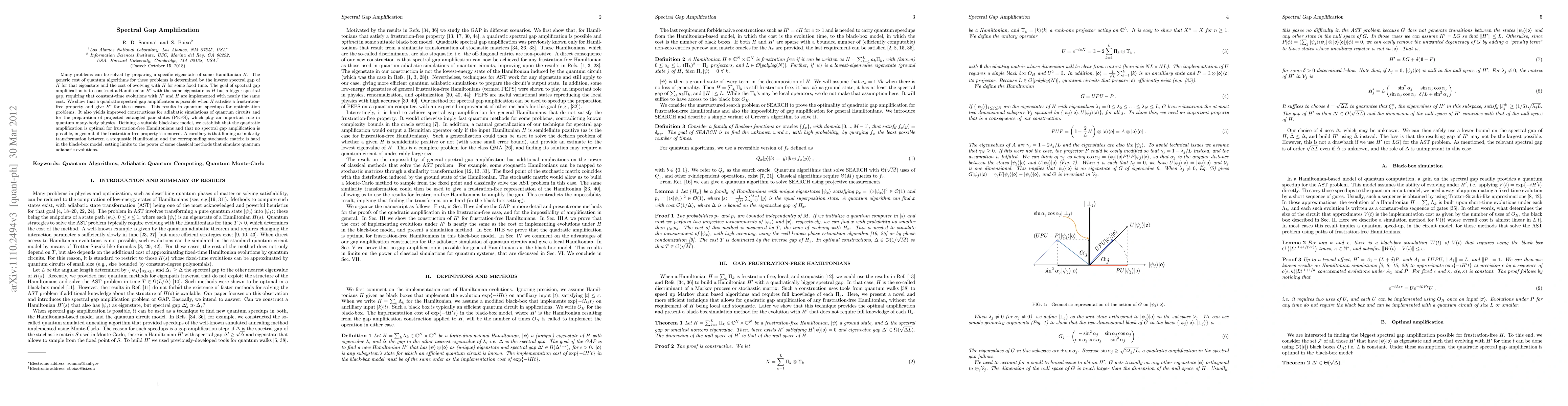 The paper introduces a method for spectral gap amplification, focusing on constructing a Hamiltonian H' with the same eigenstate as H but a larger spectral gap, while maintaining similar cost for constant-time evolutions with H' and H.