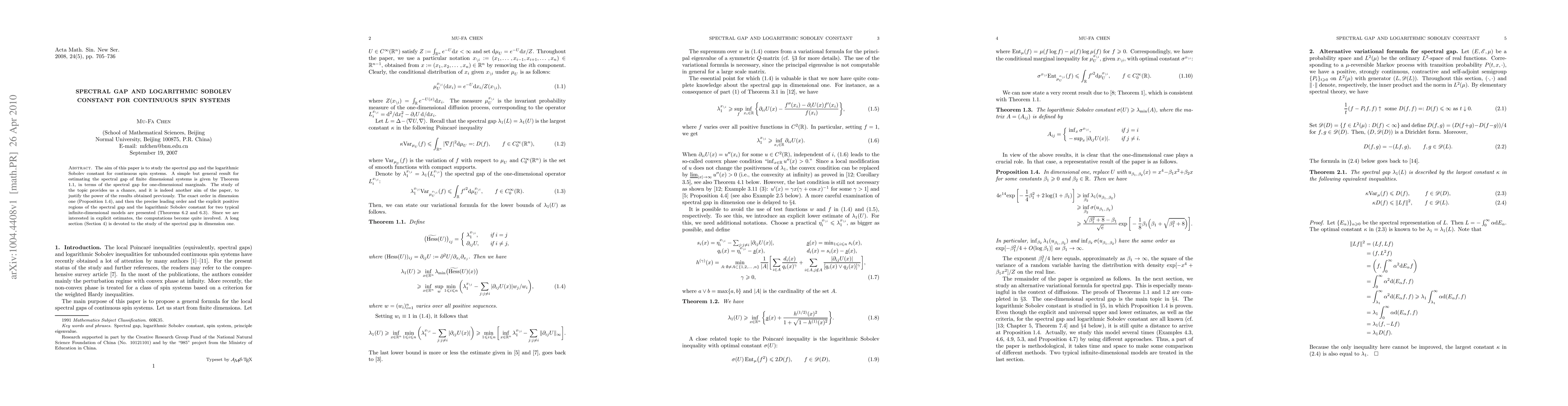 The aim of this paper is to study the spectral gap and the logarithmic Sobolev constant for continuous spin systems. A simple but general result for estimating the spectral gap of finite dimensional systems is given by Theorem 1.1, in terms of the spectral gap for one-dimensional marginals. The study of the topic provides us a chance, and it is indeed another aim of the paper, to justify the power of the results obtained previously. The exact order in dimension one (Proposition 1.4), and then the precise leading order and the explicit positive regions of the spectral gap and the logarithmic Sobolev constant for two typical infinite-dimensional models are presented (Theorems 6.2 and 6.3). Since we are interested in explicit estimates, the computations become quite involved. A long section (Section 4) is devoted to the study of the spectral gap in dimension one.
