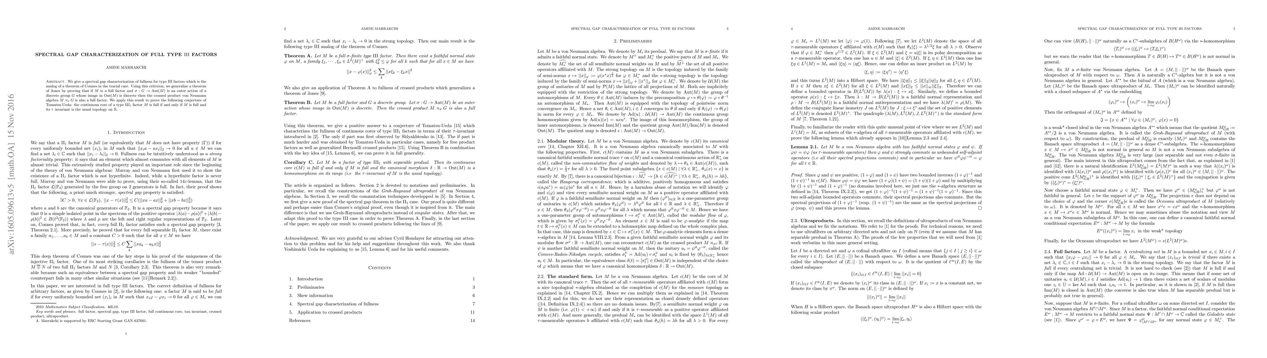 This paper characterizes fullness for type III factors through spectral gap, extending Connes' theorem for tracial cases. It proves Jones' theorem for full factors under discrete group actions, and resolves Tomatsu-Ueda's conjecture regarding the full nature of the continuous core of type III₁ factors.