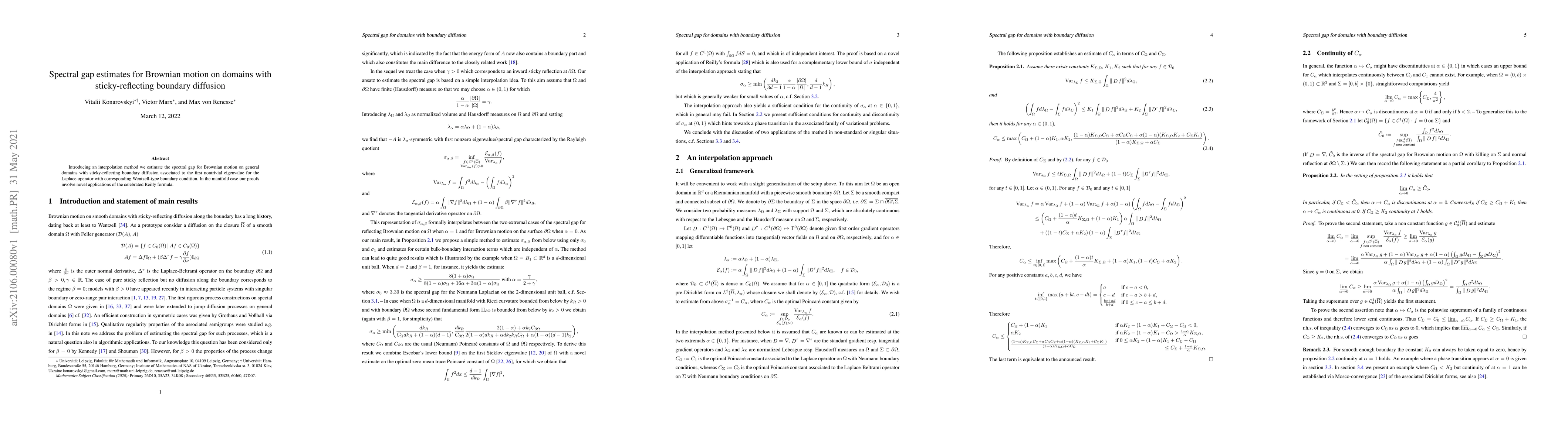 Introducing an interpolation method we estimate the spectral gap for Brownian motion on general domains with sticky-reflecting boundary diffusion associated to the first nontrivial eigenvalue for the Laplace operator with corresponding Wentzell-type boundary condition. In the manifold case our proofs involve novel applications of the celebrated Reilly formula.