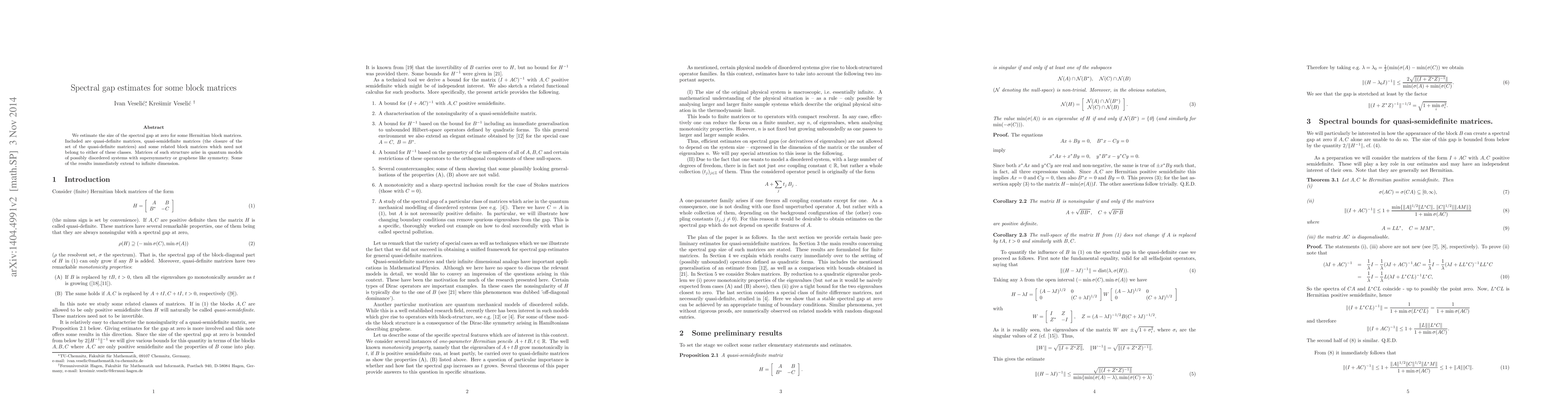 We estimate the size of the spectral gap at zero for some Hermitian block matrices. Included are quasi-definite matrices, quasi-semidefinite matrices (the closure of the set of the quasi-definite matrices) and some related block matrices which need not belong to either of these classes. Matrices of such structure arise in quantum models of possibly disordered systems with supersymmetry or graphene like symmetry. Some of the results immediately extend to infinite dimension.
