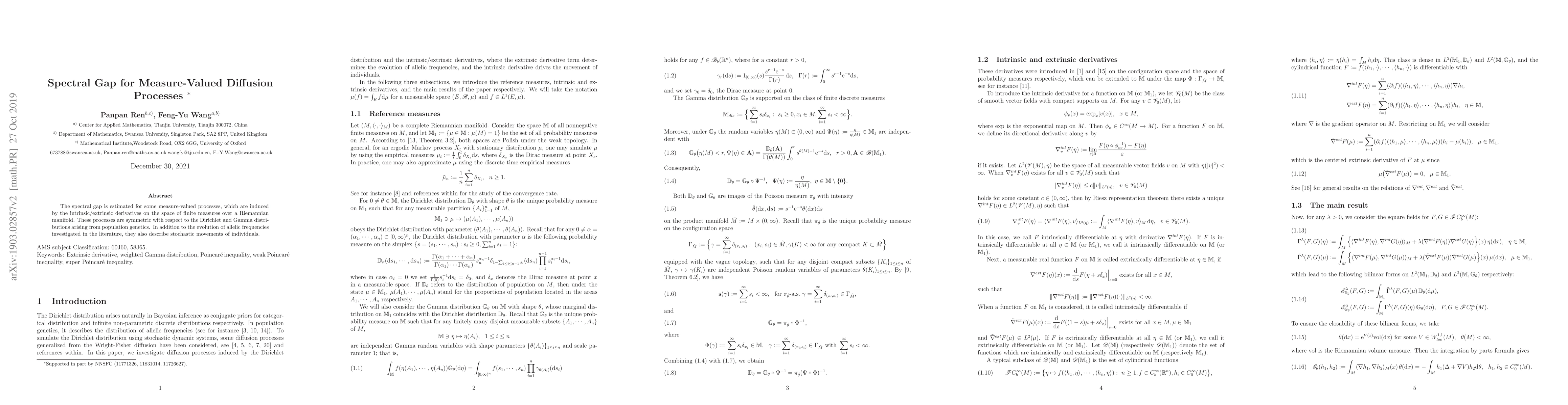 The paper estimates the spectral gap for measure-valued diffusion processes on Riemannian manifolds, providing an explicit exponential convergence rate for approximating Dirichlet and Gamma distributions relevant to population genetics.