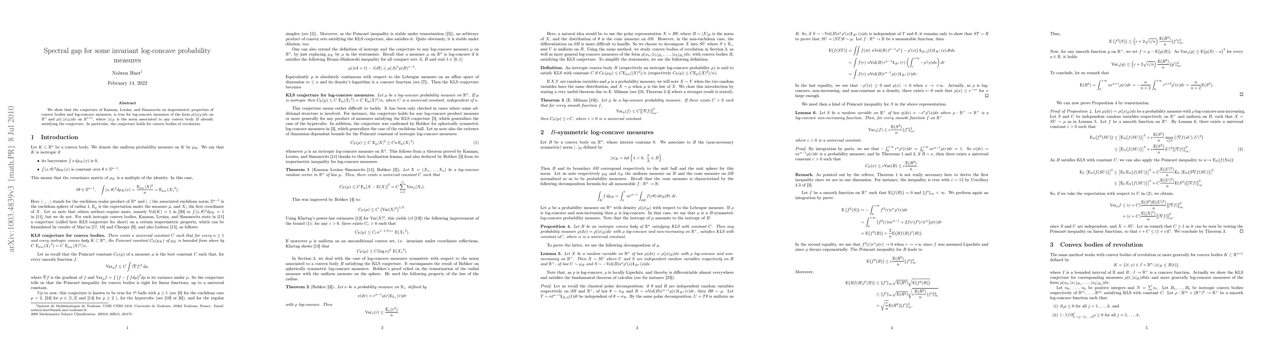 This paper confirms the Kannan-Lovász-Simonovits conjecture for specific log-concave measures defined by $\rho(|x|_B)dx$ in $\mathbb{R}^n$ and $\rho(t,|x|_B)dx$ in $\mathbb{R}^{1+n}$, demonstrating the conjecture's validity for convex bodies of revolution.