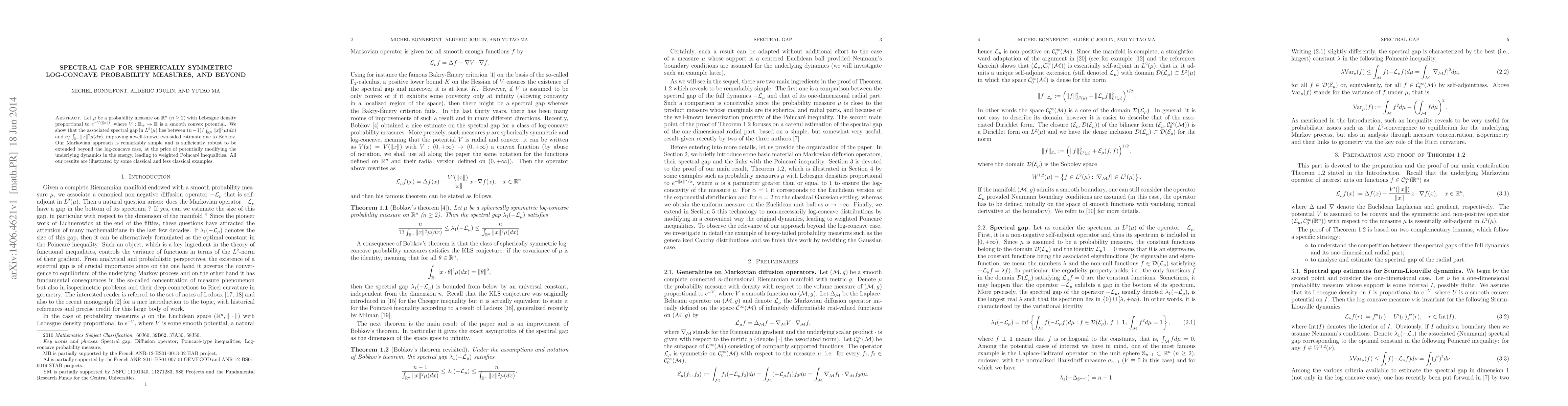 This paper establishes improved bounds for the spectral gap of spherically symmetric log-concave probability measures on $\mathbb{R}^n$ using a Markovian approach, and extends these results beyond the log-concave case, leading to weighted Poincaré inequalities. Examples are provided to illustrate the findings.