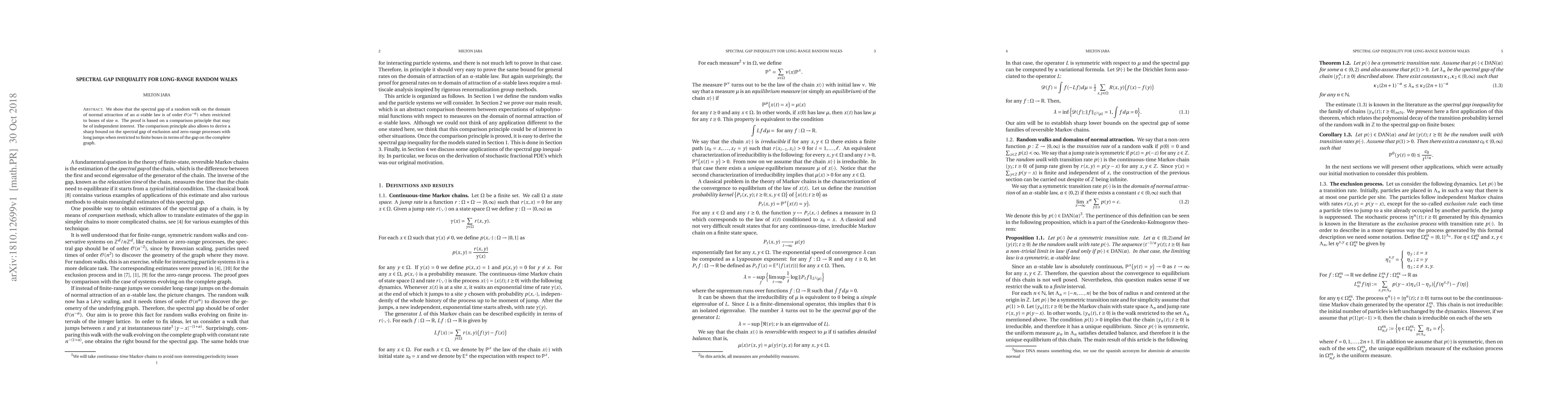 Summary: This paper demonstrates that the spectral gap of a long-range random walk follows an $\mathcal O(n^{\alpha})$ order when confined to boxes of size $n$, using a novel comparison principle. The principle also provides a precise bound for the spectral gap in exclusion and zero-range processes with long jumps.