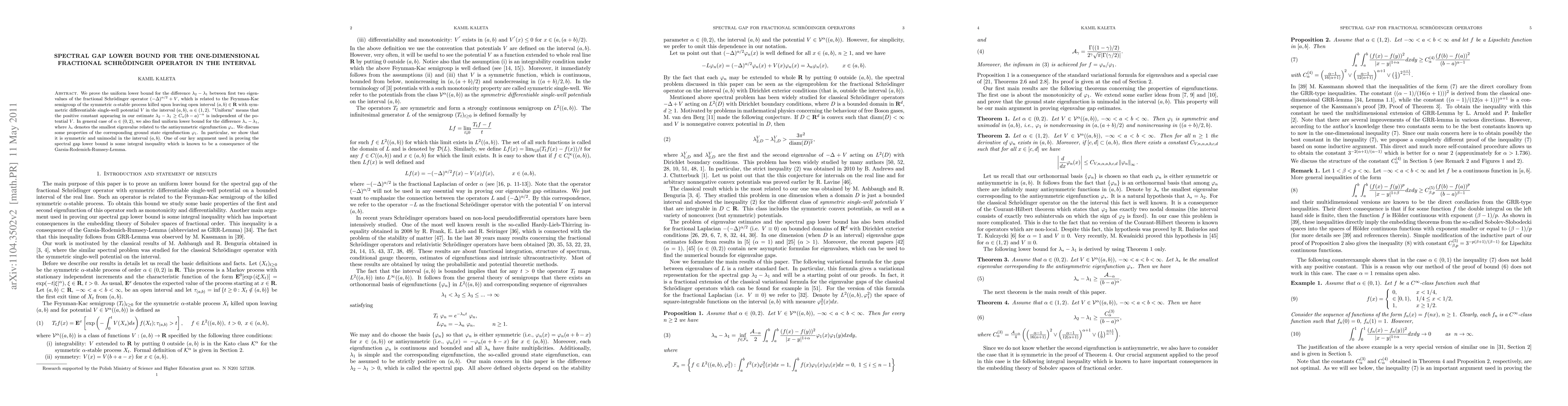 We prove the uniform lower bound for the difference $\lambda_2 - \lambda_1$ between first two eigenvalues of the fractional Schr\"odinger operator, which is related to the Feynman-Kac semigroup of the symmetric $\alpha$-stable process killed upon leaving open interval $(a,b) \in \R $ with symmetric differentiable single-well potential $V$ in the interval $(a,b)$, $\alpha \in (1,2)$. "Uniform" means that the positive constant appearing in our estimate $\lambda_2 - \lambda_1 \geq C_{\alpha} (b-a)^{-\alpha}$ is independent of the potential $V$. In general case of $\alpha \in (0,2)$, we also find uniform lower bound for the difference $\lambda_{*} - \lambda_1$, where $\lambda_{*}$ denotes the smallest eigenvalue related to the antisymmetric eigenfunction $\phi_{*}$. We discuss some properties of the corresponding ground state eigenfunction $\phi_1$. In particular, we show that it is symmetric and unimodal in the interval $(a,b)$. One of our key argument used in proving the spectral gap lower bound is some integral inequality which is known to be a consequence of the Garsia-Rodemich-Rumsey-Lemma.