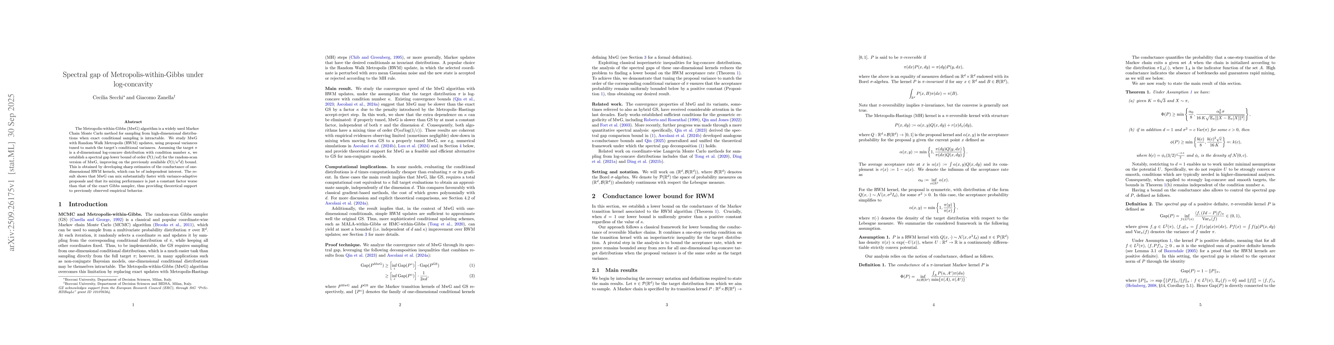 The paper analyzes the Metropolis-within-Gibbs (MwG) algorithm under log-concavity assumptions, focusing on spectral gap bounds for random-scan MwG with Random Walk Metropolis (RWM) updates. It develops sharp estimates of conductance for one-dimensional RWM kernels and derives a lower bound for the spectral gap of the MwG Markov kernel.