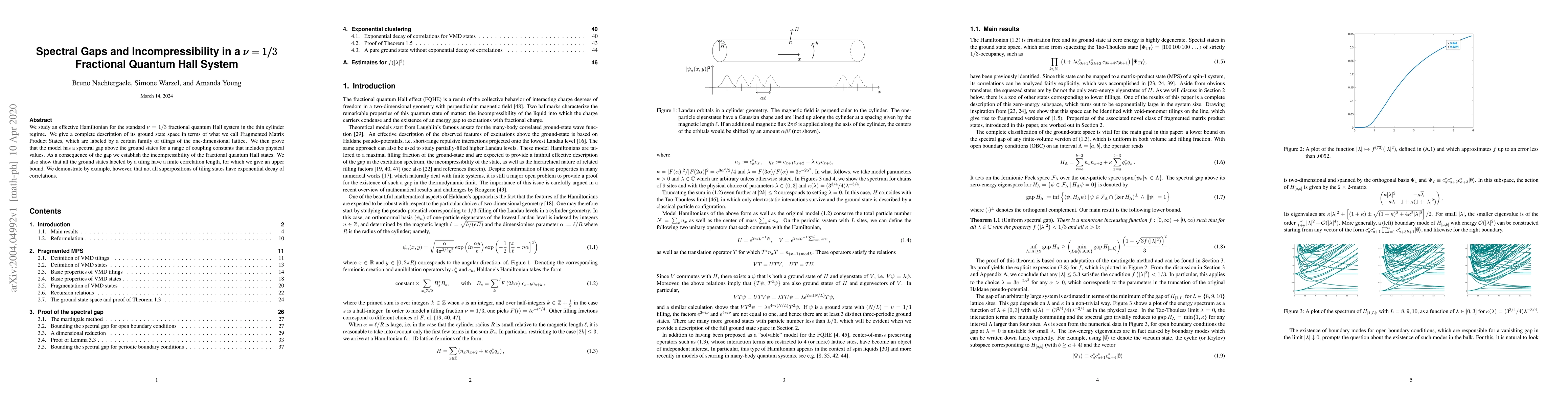 The paper introduces and utilizes Fragmented Matrix Product States (FMPS) to describe the ground state space of the $ u = 1/3$ fractional quantum Hall system, providing a rigorous proof of the spectral gap and incompressibility.