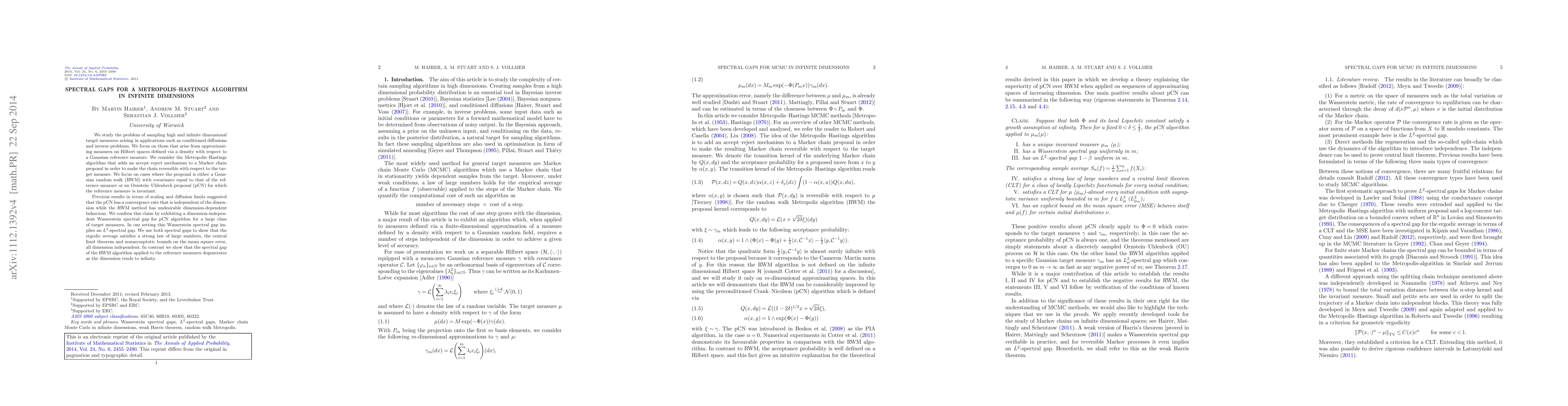 We study the problem of sampling high and infinite dimensional target measures arising in applications such as conditioned diffusions and inverse problems. We focus on those that arise from approximating measures on Hilbert spaces defined via a density with respect to a Gaussian reference measure. We consider the Metropolis-Hastings algorithm that adds an accept-reject mechanism to a Markov chain proposal in order to make the chain reversible with respect to the target measure. We focus on cases where the proposal is either a Gaussian random walk (RWM) with covariance equal to that of the reference measure or an Ornstein-Uhlenbeck proposal (pCN) for which the reference measure is invariant. Previous results in terms of scaling and diffusion limits suggested that the pCN has a convergence rate that is independent of the dimension while the RWM method has undesirable dimension-dependent behaviour. We confirm this claim by exhibiting a dimension-independent Wasserstein spectral gap for pCN algorithm for a large class of target measures. In our setting this Wasserstein spectral gap implies an $L^2$-spectral gap. We use both spectral gaps to show that the ergodic average satisfies a strong law of large numbers, the central limit theorem and nonasymptotic bounds on the mean square error, all dimension independent. In contrast we show that the spectral gap of the RWM algorithm applied to the reference measures degenerates as the dimension tends to infinity.
