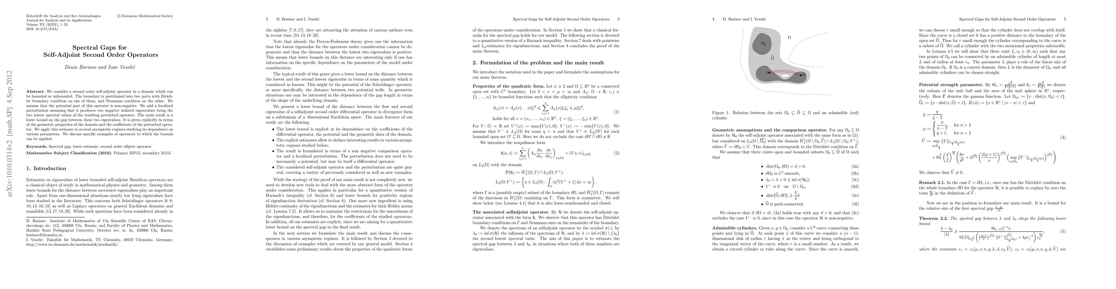 A study on spectral gaps for self-adjoint second-order operators with localized perturbations provides a lower bound on the gap between two negative eigenvalues in terms of domain geometry and operator coefficients.