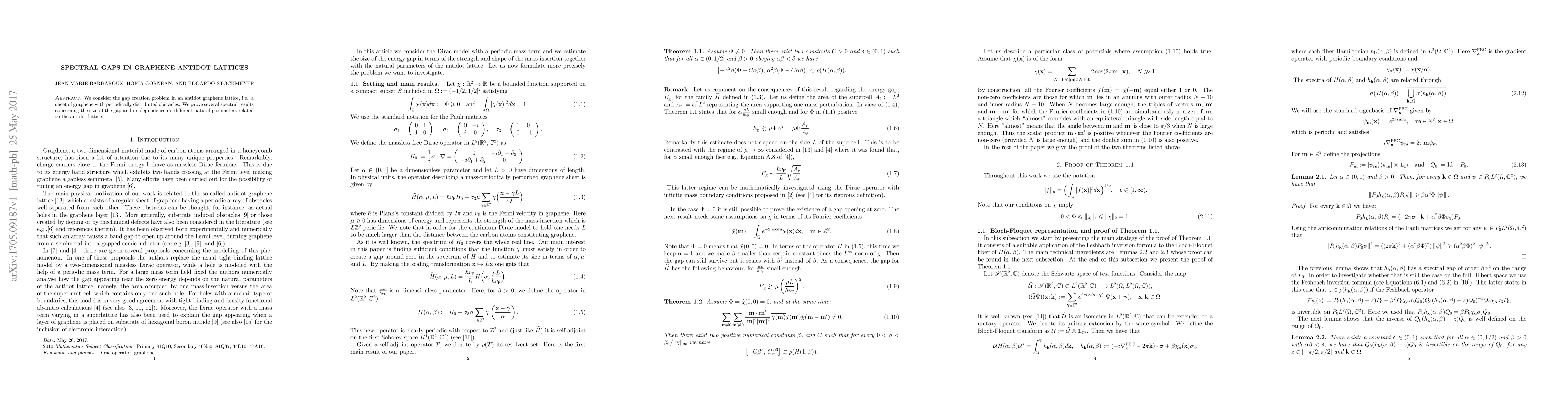 Summary: This study investigates the spectral gaps in graphene antidot lattices, proving the existence of gaps and analyzing their dependence on lattice parameters, providing insights into the gap size in the presence of periodic obstacles.