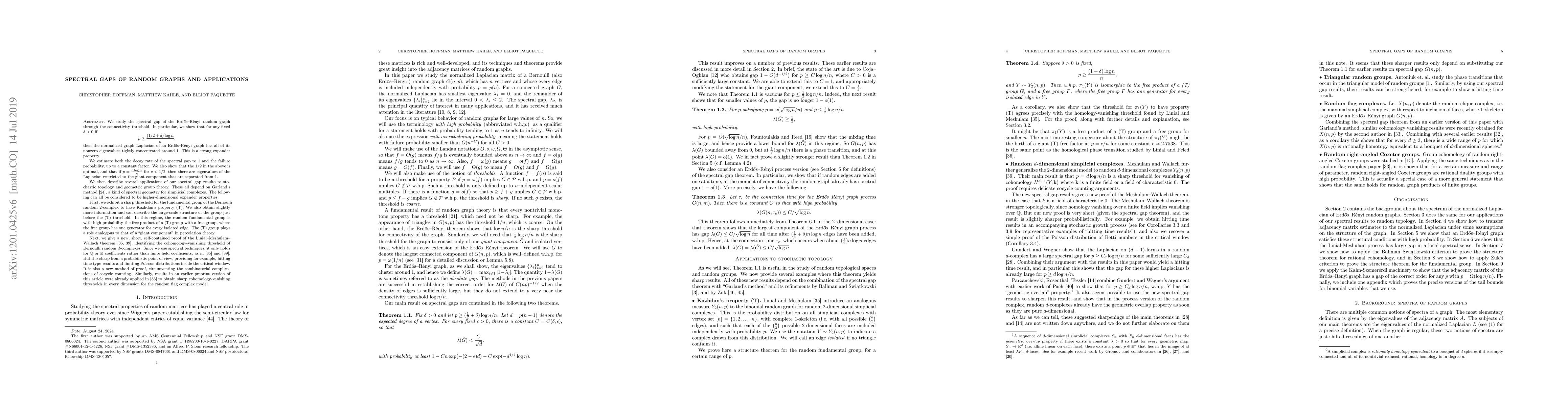 We study the spectral gap of the Erd\H{o}s--R\'enyi random graph through the connectivity threshold. In particular, we show that for any fixed $\delta > 0$ if $$p \ge \frac{(1/2 + \delta) \log n}{n},$$ then the normalized graph Laplacian of an Erd\H{o}s--R\'enyi graph has all of its nonzero eigenvalues tightly concentrated around $1$. We estimate both the decay rate of the spectral gap to $1$ and the failure probability, up to a constant factor. We also show that the $1/2$ in the above is optimal, and that if $p = \frac{c \log n}{n}$ for $c < 1/2,$ then there are eigenvalues of the Laplacian restricted to the giant component that are separated from $1.$ We then describe several applications of our spectral gap results to stochastic topology and geometric group theory. These all depend on Garland's "p-adic curvature" method, a kind of spectral geometry for simplicial complexes. These can all be considered to be high-dimensional expander properties.
