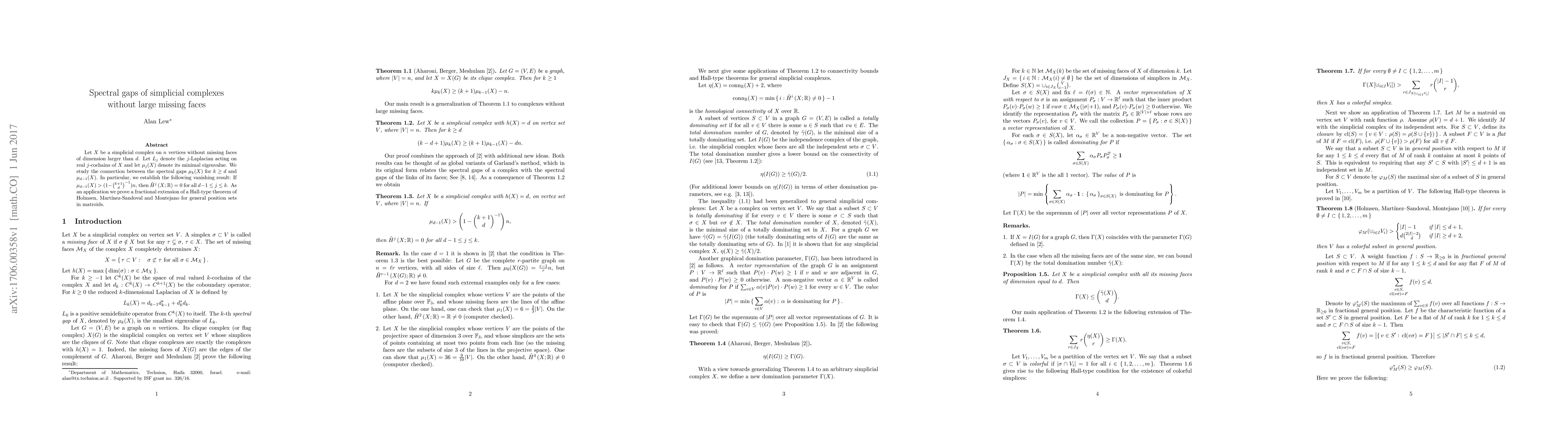 Let $X$ be a simplicial complex on $n$ vertices without missing faces of dimension larger than $d$. Let $L_{j}$ denote the $j$-Laplacian acting on real $j$-cochains of $X$ and let $\mu_{j}(X)$ denote its minimal eigenvalue. We study the connection between the spectral gaps $\mu_{k}(X)$ for $k\geq d$ and $\mu_{d-1}(X)$. In particular, we establish the following vanishing result: If $\mu_{d-1}(X)>(1-\binom{k+1}{d}^{-1})n$, then $\tilde{H}^{j}(X;\mathbb{R})=0$ for all $d-1\leq j \leq k$. As an application we prove a fractional extension of a Hall-type theorem of Holmsen, Mart\'inez-Sandoval and Montejano for general position sets in matroids.