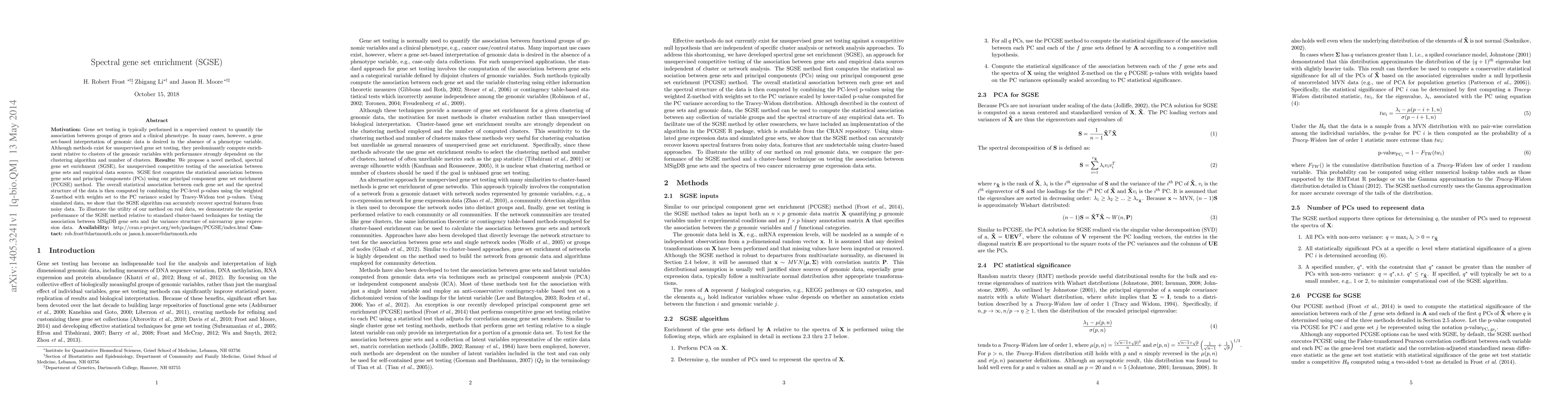 The paper introduces Spectral Gene Set Enrichment (SGSE), a novel unsupervised method for testing the association between gene sets and genomic data without a clinical phenotype. SGSE combines principal component analysis with weighted Z-method to accurately recover spectral features from noisy data and demonstrates superior performance over cluster-based techniques on real microarray data.