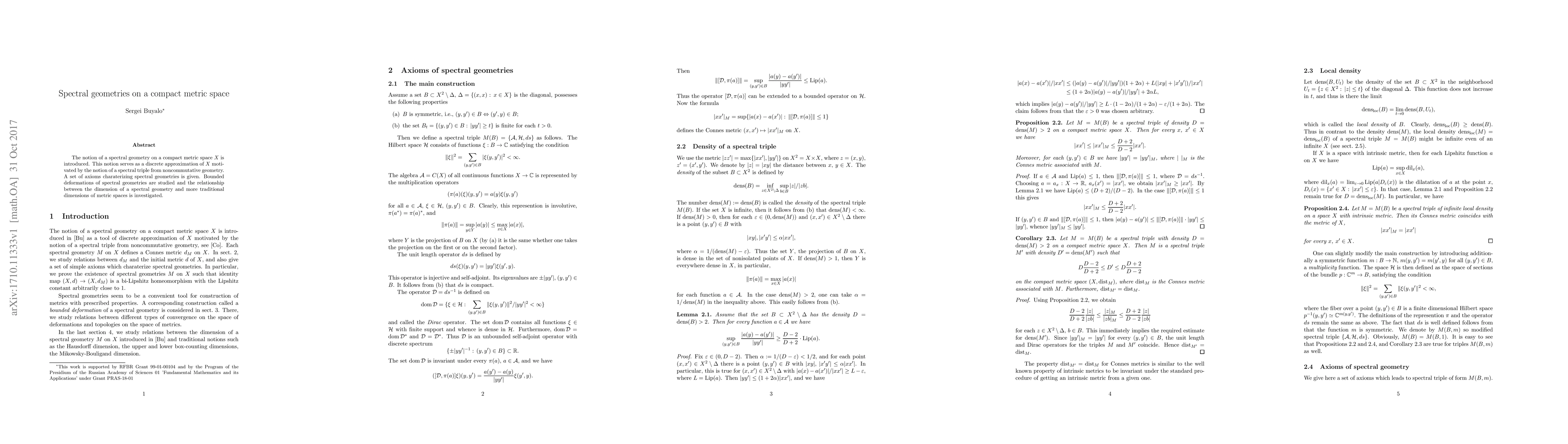 This paper introduces spectral geometries on compact metric spaces as discrete approximations inspired by spectral triples from non-commutative geometry, provides axioms characterizing them, and explores bounded deformations and their dimensional relationships with traditional metric space dimensions.