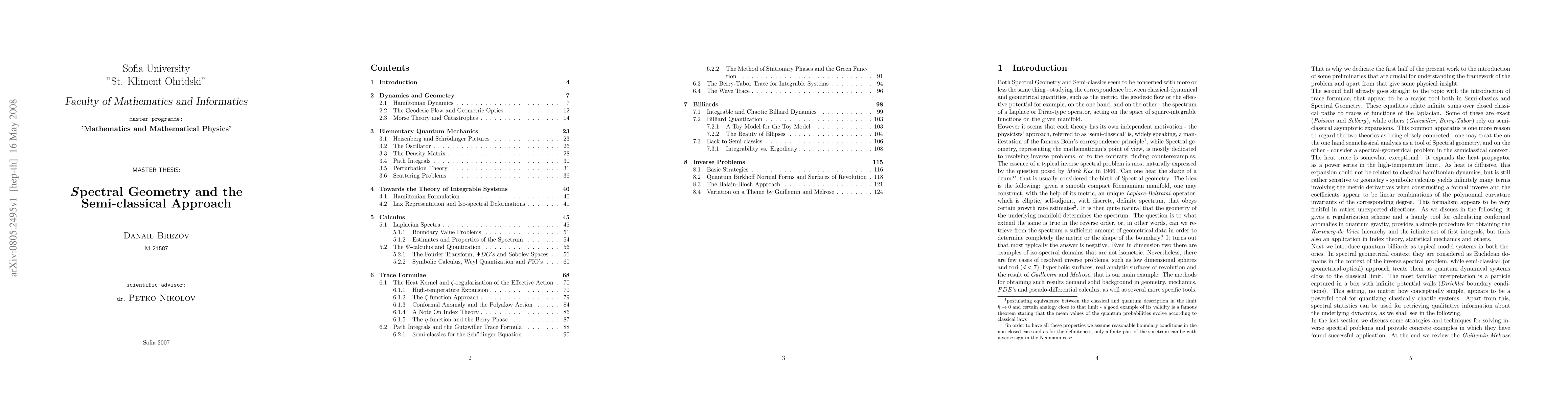 The paper is dedicated to the close analogy between these two theories - some problems lying at the very root of Spectral Geometry are viewed in the context of Semiclassics, and vise versa. The treatment starts from a very basic level and gradually goes into the deep, ending up with some rather up to date results. There are many examples concerning effective actions in QCD and String Theory, functional determinants, first integrals from asymptotic expansions, path quantization etc. The major theorems are only given brief explanations and simple constructive proofs, but some rather practical formulae are obtained in return. There is a small exercise at the end - obtaining explicit expressions for the spectral variations of the Robin problem for a planar domain. The final result is purely in the spirit of the familiar Sationary Perturbation Theory. The idea for investigating this particular problem (in the context of an old exact inverse result obtained by Guillemin and Melrose), very much motivating most of the work, belongs to my scientific advisor Dr. Petko Nikolov.