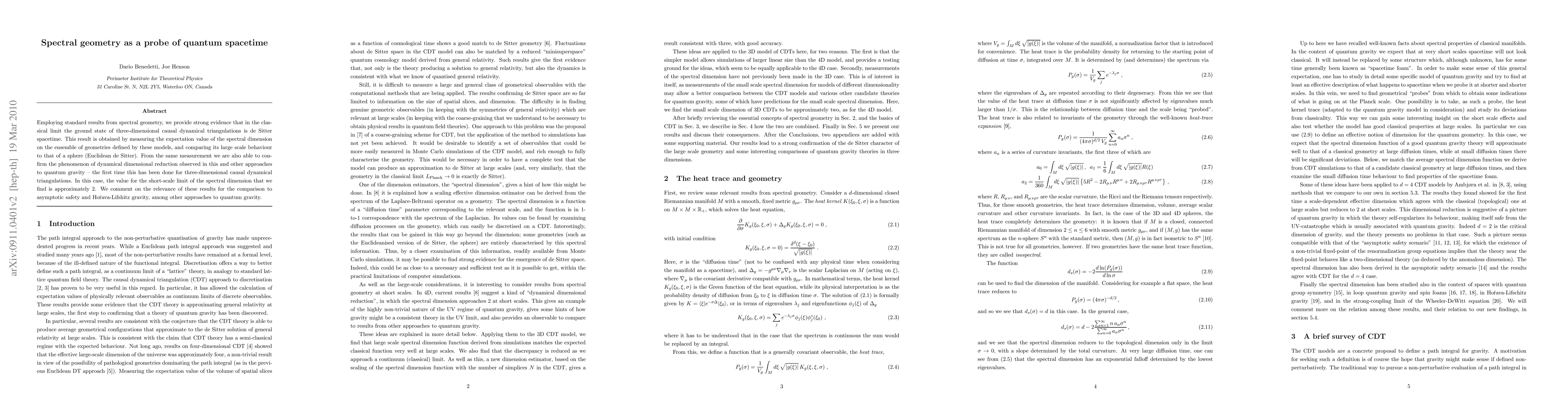 This paper uses spectral geometry to demonstrate that three-dimensional causal dynamical triangulations converge to de Sitter spacetime in the classical limit, confirming dynamical dimensional reduction to two dimensions. The findings also have implications for comparing with other quantum gravity theories like asymptotic safety and Horava-Lifshitz gravity.