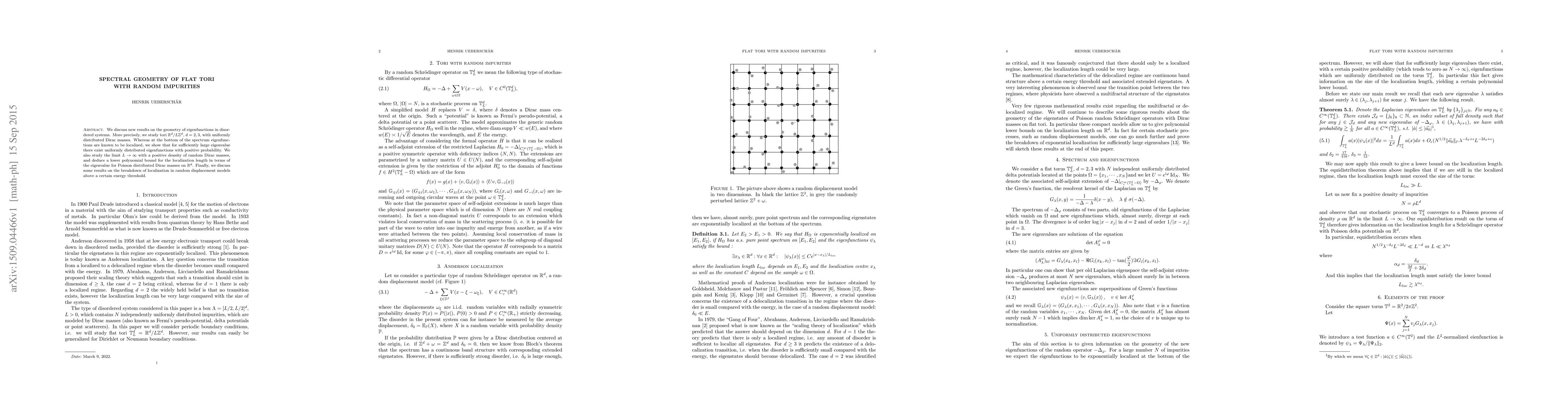 The paper explores the spectral geometry of flat tori with random impurities, demonstrating that for large eigenvalues, uniformly distributed eigenfunctions exist with positive probability. It also provides a polynomial bound for localization length as L approaches infinity with a positive density of random Dirac masses, and discusses the breakdown of localization in random displacement models above a certain energy threshold.