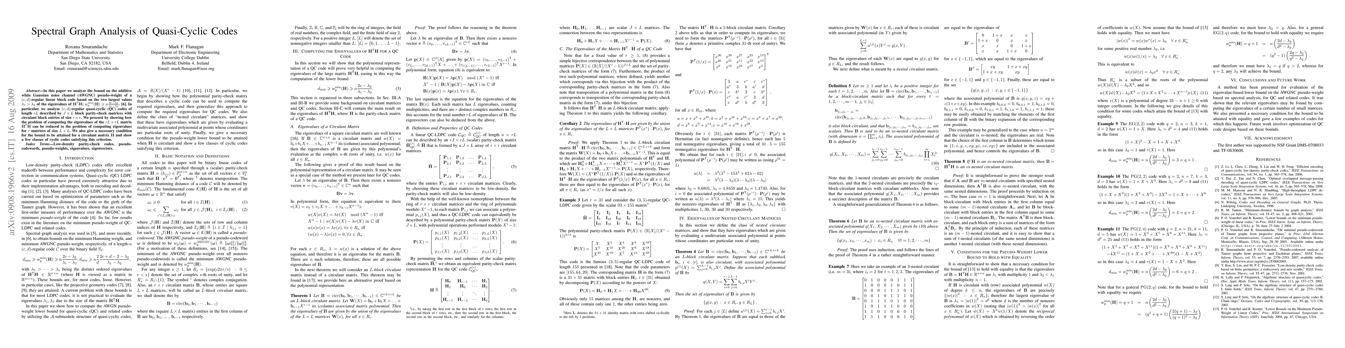 In this paper we analyze the bound on the additive white Gaussian noise channel (AWGNC) pseudo-weight of a (c,d)-regular linear block code based on the two largest eigenvalues of H^T H. In particular, we analyze (c,d)-regular quasi-cyclic (QC) codes of length rL described by J x L block parity-check matrices with circulant block entries of size r x r. We proceed by showing how the problem of computing the eigenvalues of the rL x rL matrix H^T H can be reduced to the problem of computing eigenvalues for r matrices of size L x L. We also give a necessary condition for the bound to be attained for a circulant matrix H and show a few classes of cyclic codes satisfying this criterion.