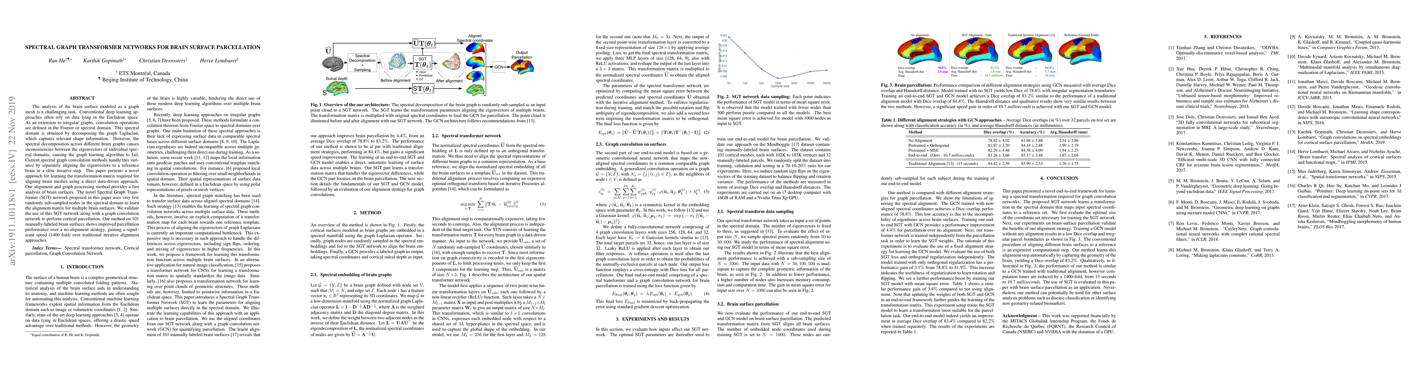 This paper introduces a Spectral Graph Transformer (SGT) network for brain surface parcellation, which aligns brain meshes using a data-driven approach, significantly speeding up the process compared to traditional methods. The SGT network, combined with a graph convolution network, improves parcellation performance and achieves a 1400-fold speed increase.