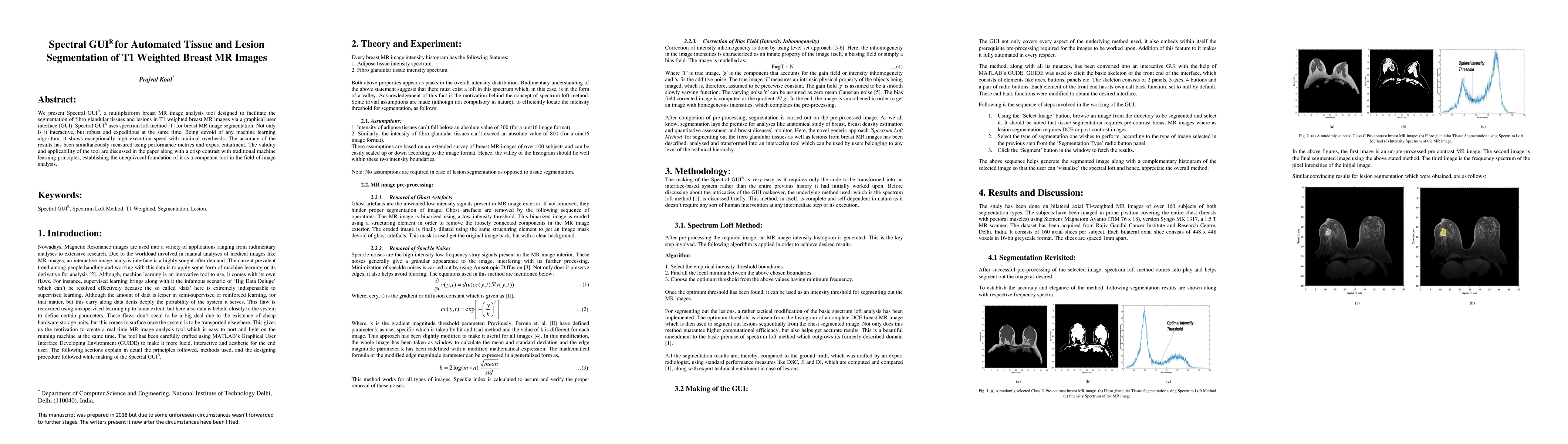Spectral GUI is a multiplatform tool for segmenting fibro glandular tissues and lesions in T1 weighted breast MR images using a graphical user interface and the spectrum loft method. It offers high execution speed and accuracy, contrasting with traditional machine learning approaches.
