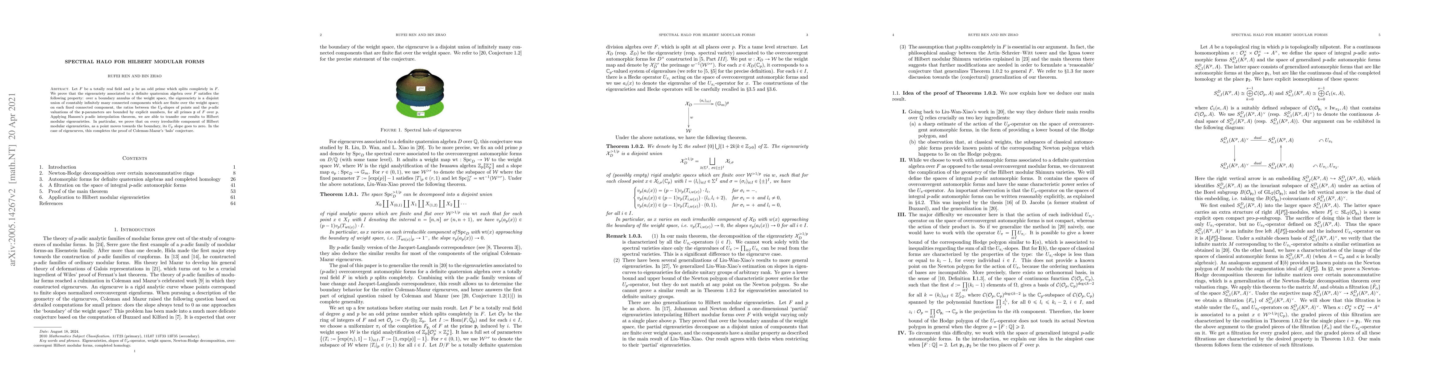 Let $F$ be a totally real field and $p$ be an odd prime which splits completely in $F$. We prove that the eigenvariety associated to a definite quaternion algebra over $F$ satisfies the following property: over a boundary annulus of the weight space, the eigenvariety is a disjoint union of countably infinitely many connected components which are finite over the weight space; on each fixed connected component, the ratios between the $U_\mathfrak{p}$-slopes of points and the $p$-adic valuations of the $\mathfrak{p}$-parameters are bounded by explicit numbers, for all primes $\mathfrak{p}$ of $F$ over $p$. Applying Hansen's $p$-adic interpolation theorem, we are able to transfer our results to Hilbert modular eigenvarieties. In particular, we prove that on every irreducible component of Hilbert modular eigenvarieties, as a point moves towards the boundary, its $U_p$ slope goes to zero. In the case of eigencurves, this completes the proof of Coleman-Mazur's `halo' conjecture.
