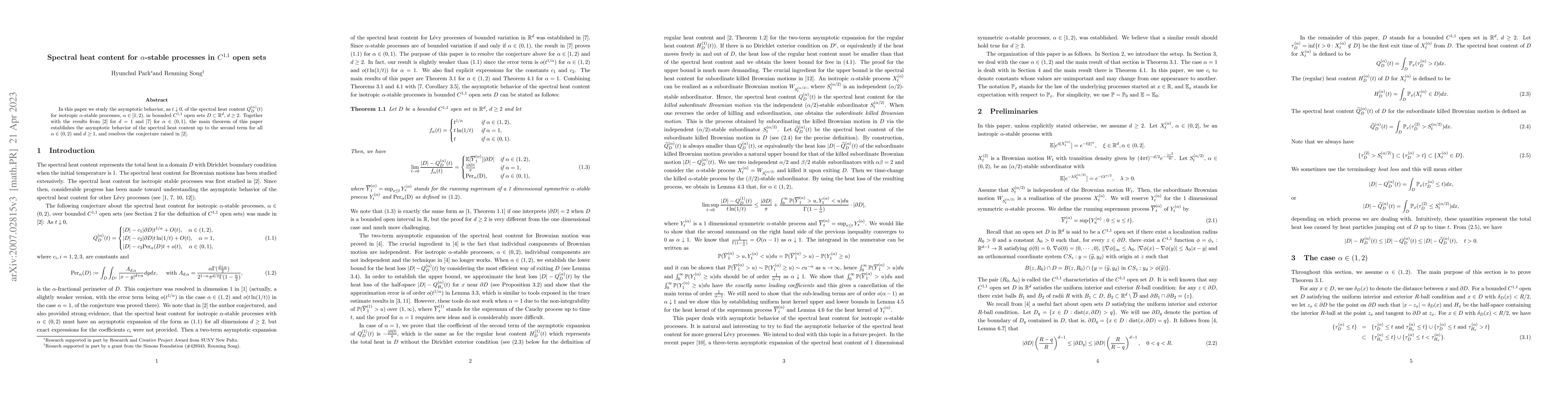This paper investigates the asymptotic behavior of the spectral heat content for isotropic $\alpha$-stable processes in bounded $C^{1,1}$ open sets as $t$ approaches zero. It establishes the asymptotic behavior up to the second term for $\alpha \in (0,2)$ and $d \geq 1$, resolving a conjecture from previous research.