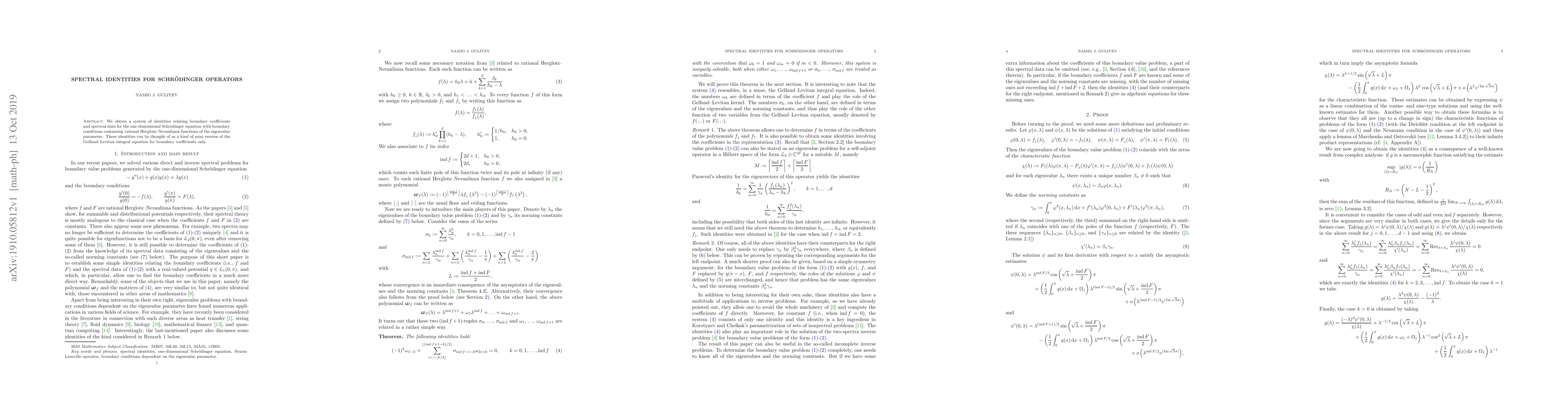 Summary: This paper establishes a set of identities linking boundary coefficients and spectral data for one-dimensional Schrödinger operators with rational Herglotz-Nevanlinna functions, functioning as a simplified version of the Gelfand-Levitan integral equation. These identities provide insights into the relationship between boundary conditions and spectral properties.