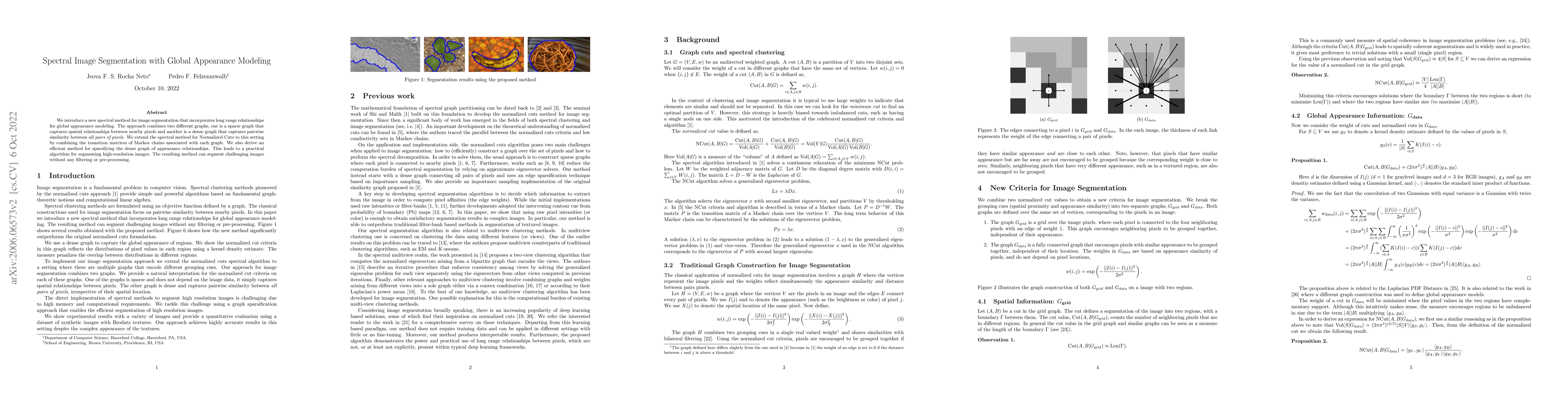 This paper presents a spectral segmentation method that uses global appearance modeling through two graphs: a sparse graph for spatial relationships and a dense graph for pairwise pixel similarities. It combines these graphs via Normalized Cuts and efficiently sparsifies the dense graph, enabling practical segmentation of high-resolution images without pre-processing.