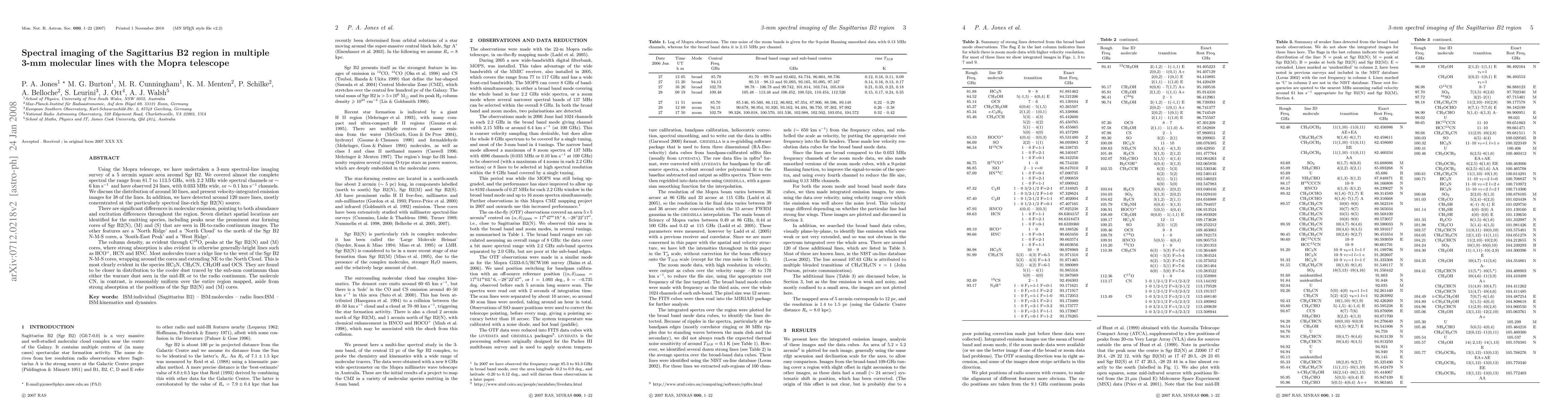 Using the Mopra telescope, we have undertaken a 3-mm spectral-line imaging survey of a 5 x 5 arcmin^2 area around Sgr B2. We covered almost the complete spectral the range from 81.7 to 113.5 GHz, with 2.2 MHz wide spectral channels or ~ 6 km/s, and have observed 24 lines, with 0.033 MHz wide, or ~ 0.1 km/s channels. We discuss the distribution of around 50 lines, and present velocity-integrated emission images for 38 of the lines. In addition, we have detected around 120 more lines, mostly concentrated at the particularly spectral line-rich Sgr B2(N) source. There are significant differences in molecular emission, pointing to both abundance and excitation differences throughout the region. Seven distinct spatial locations are identified for the emitting species, including peaks near the prominent star forming cores of Sgr B2(N), (M) and (S) that are seen in IR-to-radio continuum images. The other features are a 'North Ridge' and a 'North Cloud' to the north of the Sgr B2 N-M-S cores, a 'South-East Peak' and a 'West Ridge'. The column density, as evident through C^{18}O, peaks at the Sgr B2(N) and (M) cores, where strong absorption is also evident in otherwise generally bright lines such as HCO^{+}, HCN and HNC. Most molecules trace a ridge line to the west of the Sgr B2 N-M-S cores, wrapping around the cores and extending NE to the North Cloud. This is most clearly evident in the species HC_{3}N, CH_{3}CN, CH_{3}OH and OCS. They are found to be closer in distribution to the cooler dust traced by the sub-mm continuum than either the warmer dust seen in the mid-IR or to the radio continuum. The molecule CN, in contrast, is reasonably uniform over the entire region mapped, aside from strong absorption at the positions of the Sgr B2(N) and (M) cores.