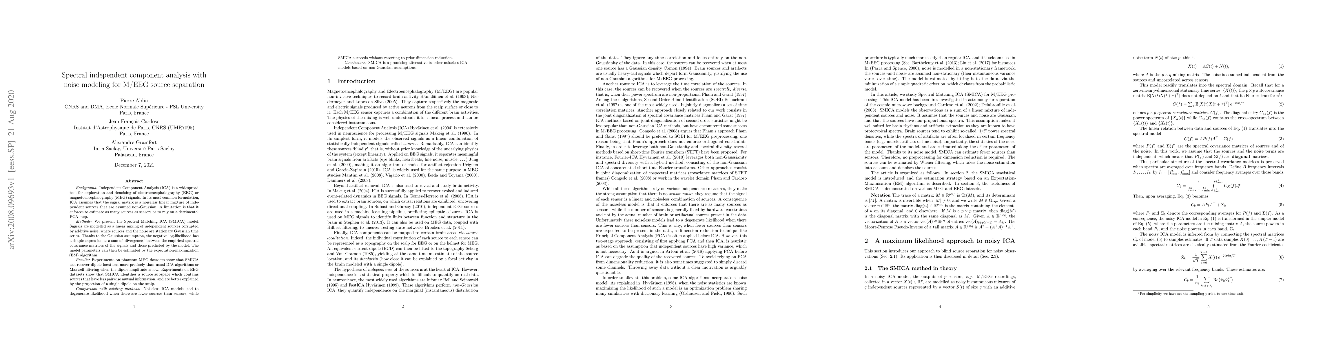Researchers developed a new method called Spectral Matching ICA (SMICA) that uses Gaussian noise modeling to improve source separation in M/EEG signals, achieving more precise dipole location recovery than existing methods.
