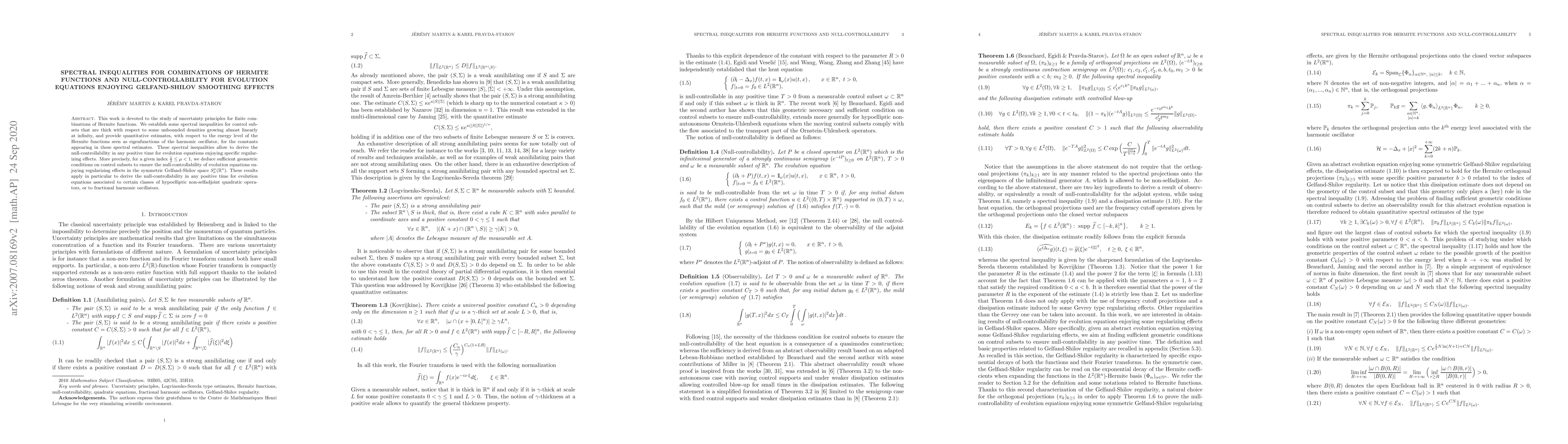 This work is devoted to the study of uncertainty principles for finite combinations of Hermite functions. We establish some spectral inequalities for control subsets that are thick with respect to some unbounded densities growing almost linearly at infinity, and provide quantitative estimates, with respect to the energy level of the Hermite functions seen as eigenfunctions of the harmonic oscillator, for the constants appearing in these spectral estimates. These spectral inequalities allow to derive the null-controllability in any positive time for evolution equations enjoying specific regularizing effects. More precisely, for a given index $\frac{1}{2} \leq \mu <1$, we deduce sufficient geometric conditions on control subsets to ensure the null-controllability of evolution equations enjoying regularizing effects in the symmetric Gelfand-Shilov space $S^{\mu}_{\mu}(\mathbb{R}^n)$. These results apply in particular to derive the null-controllability in any positive time for evolution equations associated to certain classes of hypoelliptic non-selfadjoint quadratic operators, or to fractional harmonic oscillators.