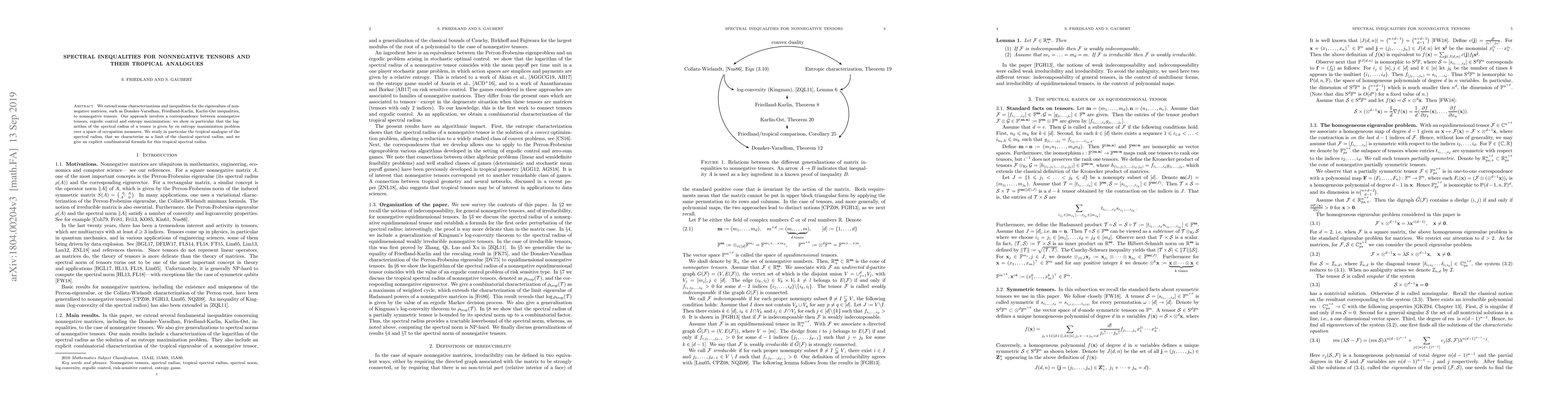 This paper extends classical spectral inequalities for nonnegative matrices to nonnegative tensors, establishing a connection between tensors, ergodic control, and entropy maximization. It also characterizes the tropical analogue of the spectral radius and provides an explicit combinatorial formula for it.