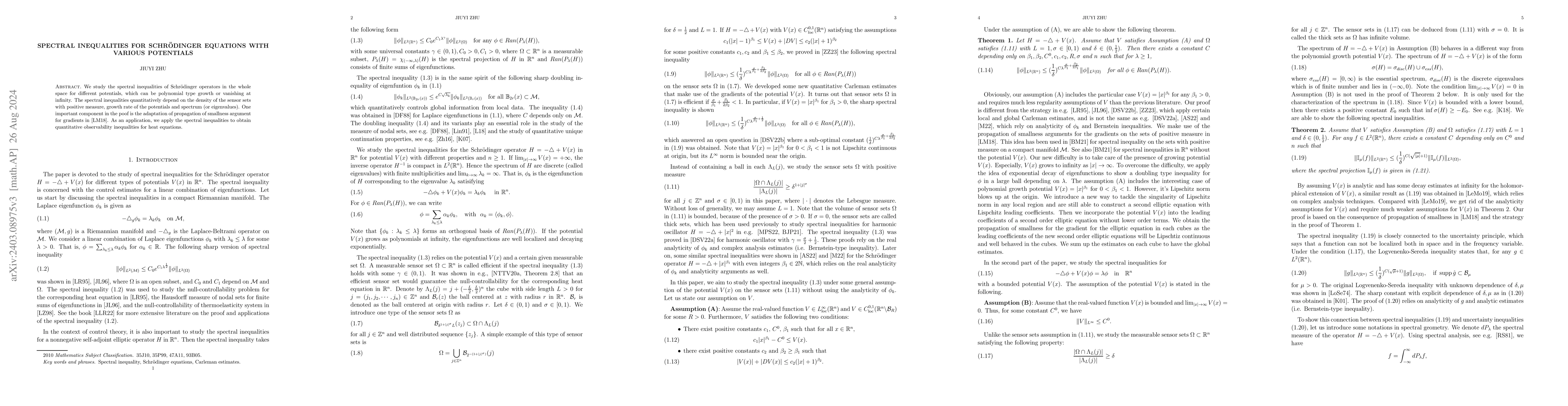 This paper investigates spectral inequalities for Schrödinger operators across various potential types, focusing on their dependence on sensor set density, potential growth rates, and the spectrum. The study adapts a propagation of smallness argument for gradient proofs, and applies these inequalities to derive quantitative observability inequalities for heat equations.