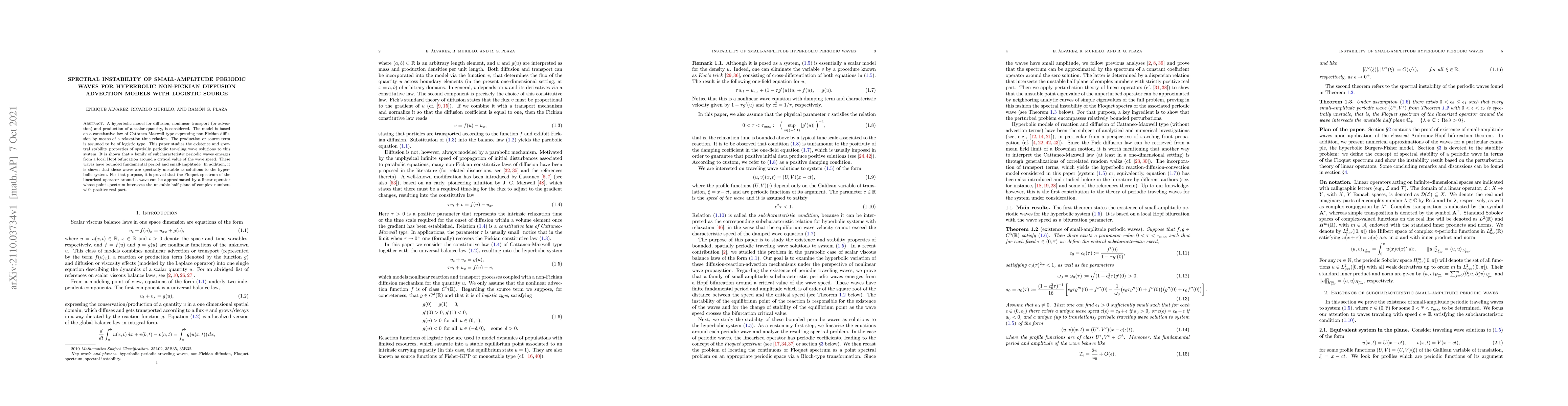 The research employs a combination of analytical techniques and numerical approximations to study the existence and spectral instability of small-amplitude periodic traveling waves in a hyperbolic non-Fickian diffusion advection model with logistic source.