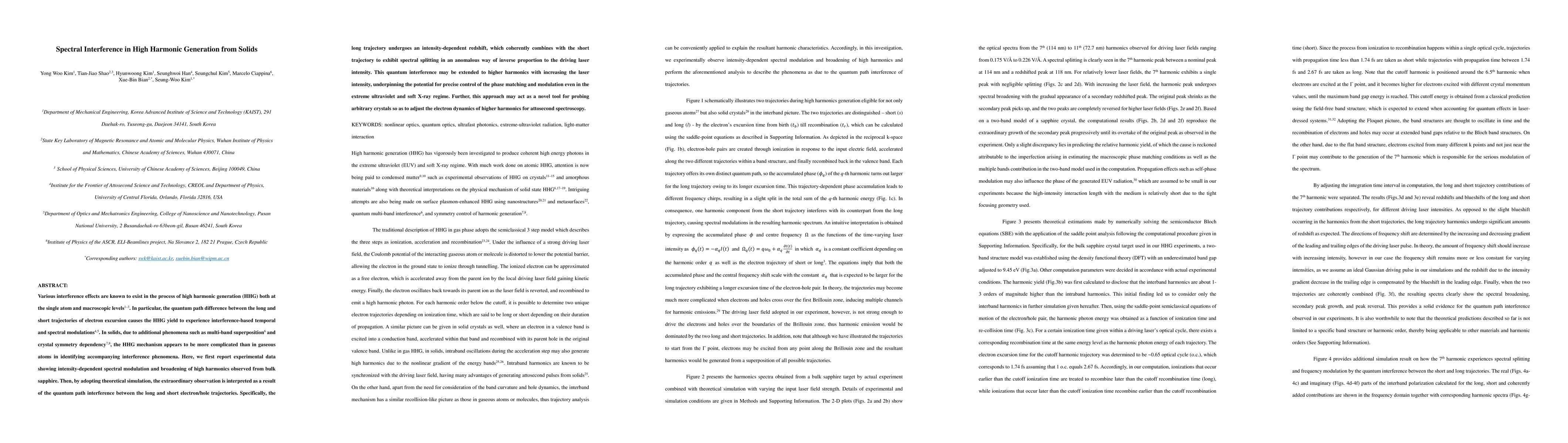 This paper reports experimental and theoretical findings on spectral interference in high harmonic generation (HHG) from bulk sapphire, revealing intensity-dependent spectral modulation and broadening due to quantum path interference between long and short electron/hole trajectories. The study suggests potential for precise control of phase matching in extreme ultraviolet and soft X-ray regimes, and proposes a novel method for probing crystal electron dynamics in attosecond spectroscopy.