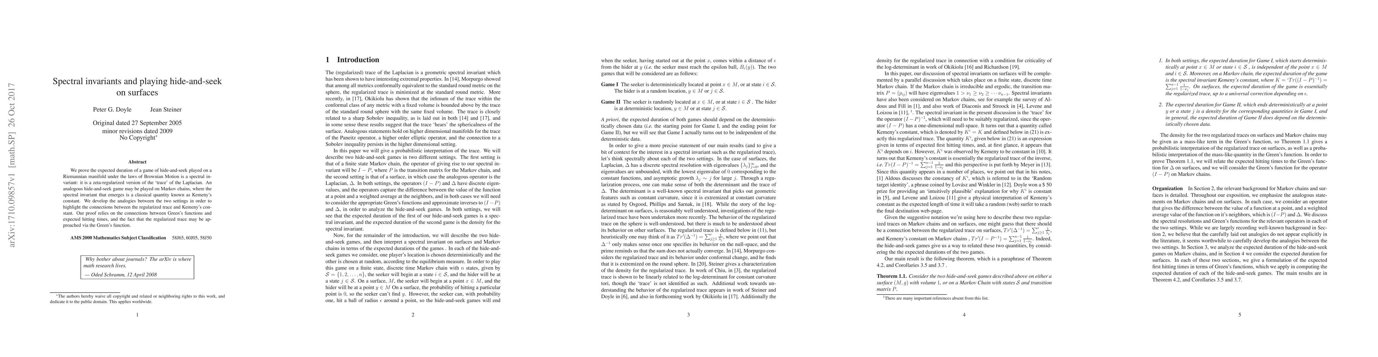 The paper proves that the expected duration of a hide-and-seek game on a Riemannian manifold under Brownian Motion is a spectral invariant, specifically a zeta-regularized version of the trace of the Laplacian. It also establishes an analogous game on Markov chains, where the emerging spectral invariant is Kemeny's constant.