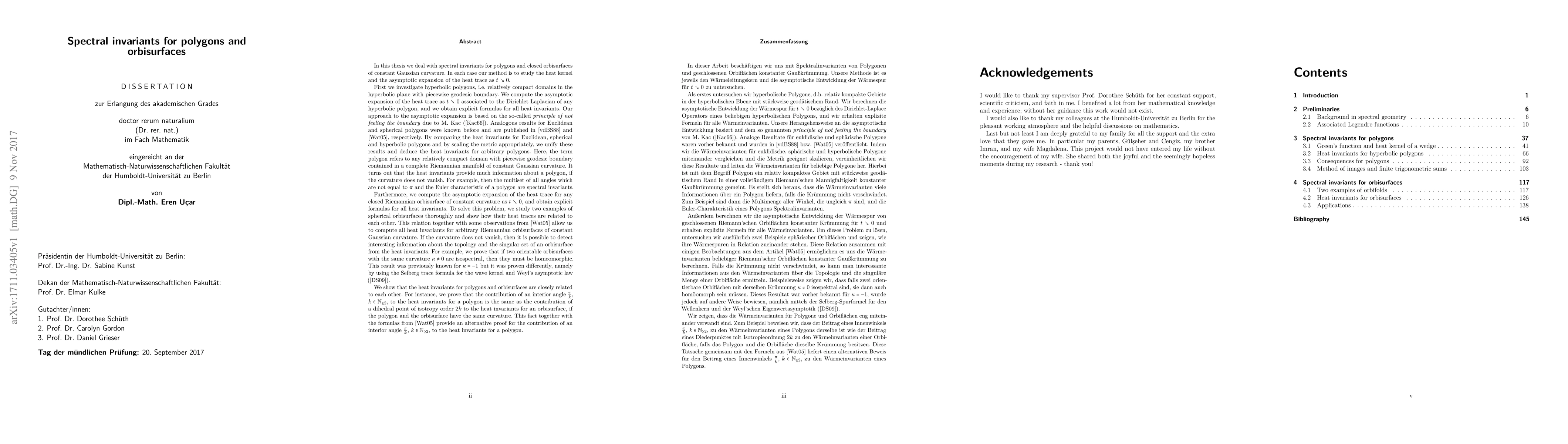 In this thesis we deal with spectral invariants for polygons and closed orbisurfaces of constant Gaussian curvature. In each case our method is to study the heat kernel and the asymptotic expansion of the heat trace. First, we investigate hyperbolic polygons, i.e. relatively compact domains in the hyperbolic plane with piecewise geodesic boundary. We compute the asymptotic expansion of the heat trace associated to the Dirichlet Laplacian of any hyperbolic polygon, and we obtain explicit formulas for all heat invariants. Analogous results for Euclidean and spherical polygons were known before. We unify these results and deduce the heat invariants for arbitrary polygons, i.e. for relatively compact domains with piecewise geodesic boundary contained in a complete Riemannian manifold of constant Gaussian curvature. It turns out that the heat invariants provide much information about a polygon, if the curvature does not vanish. For example, then the multiset of all real angles (i.e. those which are not equal to pi) and the Euler characteristic of a polygon are spectral invariants. Furthermore, we compute the asymptotic expansion of the heat trace for any closed Riemannian orbisurface of constant curvature, and obtain explicit formulas for all heat invariants. If the curvature does not vanish, then it is possible to detect interesting information about the topology and the singular set of an orbisurface from the heat invariants.