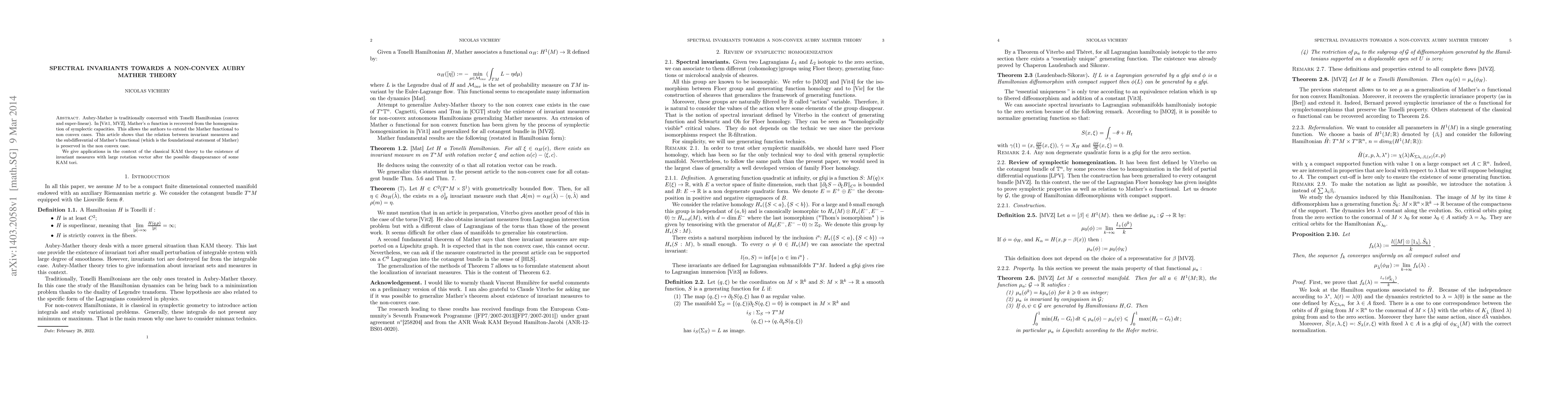 Aubry-Mather is traditionally concerned with Tonelli Hamiltonian (convex and super-linear). In \cite{Vi,MVZ}, Mather's $\alpha$ function is recovered from the homogenization of symplectic capacities. This allows the authors to extend the Mather functional to non convex cases. This article shows that the relation between invariant measures and the subdifferential of Mather's functional (which is the foundational statement of Mather) is preserved in the non convex case. We give applications in the context of the classical KAM theory to the existence of invariant measures with large rotation vector after the possible disappearance of some KAM tori.