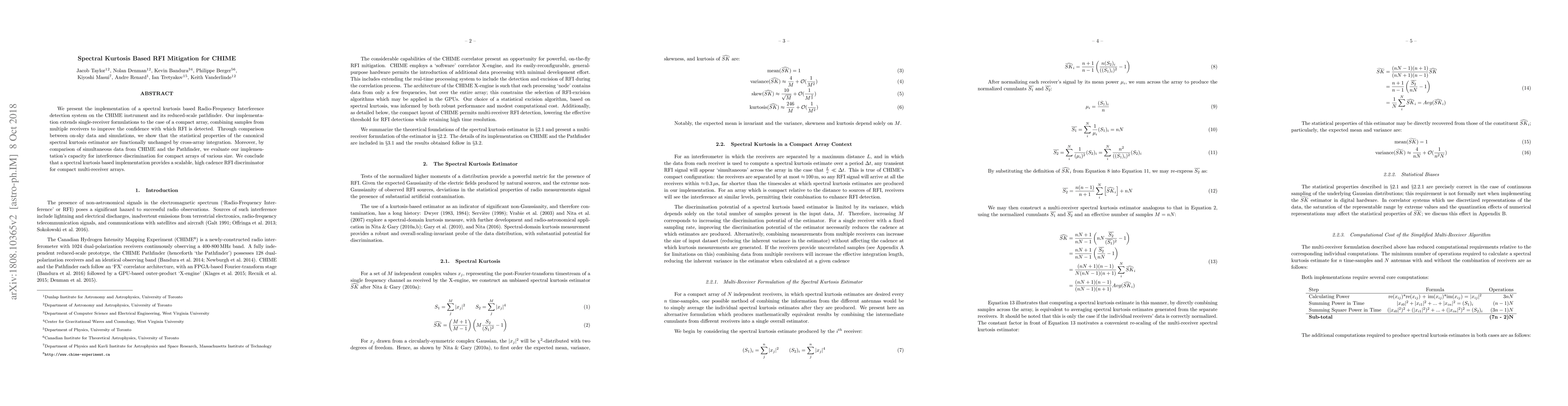 A new method for detecting Radio Frequency Interference (RFI) using spectral kurtosis has been successfully implemented on the CHIME instrument, showing high cadence RFI discrimination capabilities for compact multi-receiver arrays.