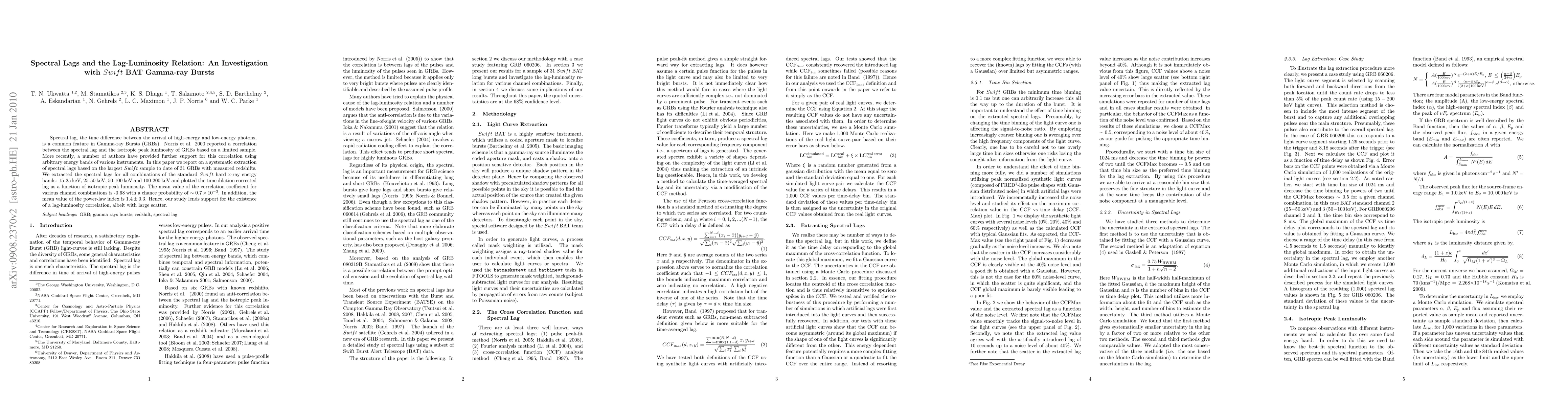 This paper investigates spectral lags in Swift BAT Gamma-ray Bursts, finding a correlation between spectral lag and isotropic peak luminosity with a correlation coefficient of -0.68, supporting the lag-luminosity relation despite significant scatter.