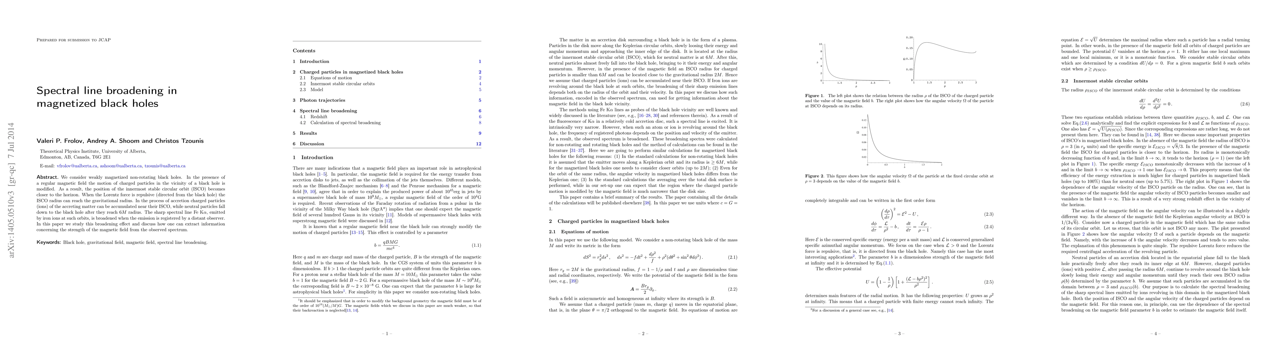 We consider weakly magnetized non-rotating black holes. In the presence of a regular magnetic field the motion of charged particles in the vicinity of a black hole is modified. As a result, the position of the innermost stable circular orbit (ISCO) becomes closer to the horizon. When the Lorentz force is repulsive (directed from the black hole) the ISCO radius can reach the gravitational radius. In the process of accretion charged particles (ions) of the accreting matter can be accumulated near their ISCO, while neutral particles fall down to the black hole after they reach $6M$ radius. The sharp spectral line Fe K$\alpha$, emitted by iron ions at such orbits, is broadened when the emission is registered by a distant observer. In this paper we study this broadening effect and discuss how one can extract information concerning the strength of the magnetic field from the observed spectrum.