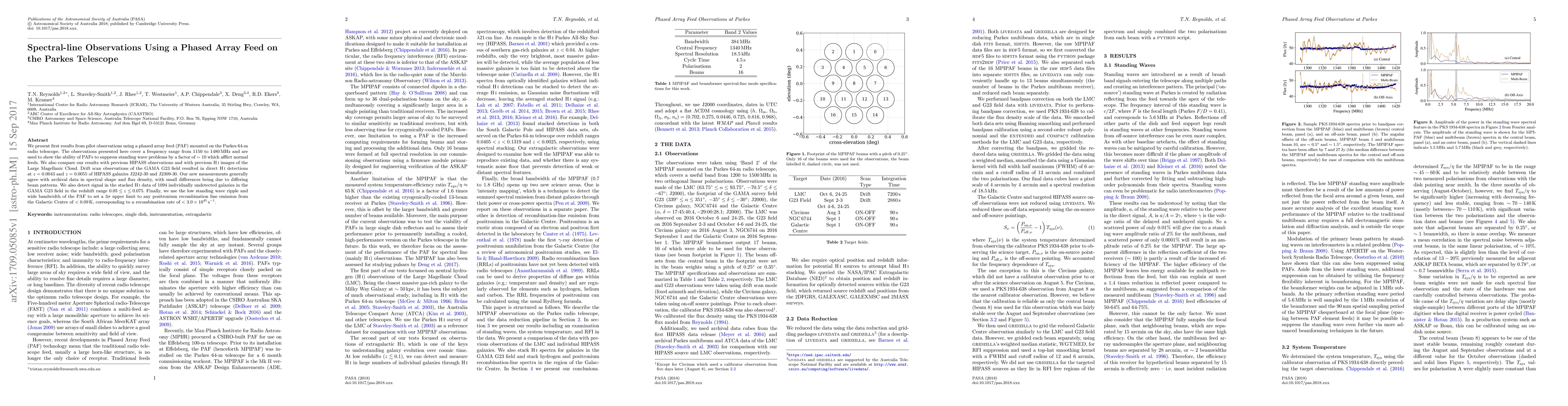 We present first results from pilot observations using a phased array feed (PAF) mounted on the Parkes 64-m radio telescope. The observations presented here cover a frequency range from 1150 to 1480 MHz and are used to show the ability of PAFs to suppress standing wave problems by a factor of $\sim10$ which afflict normal feeds. We also compare our results with previous HIPASS observations and with previous HI images of the Large Magellanic Cloud. Drift scan observations of the GAMA G23 field resulted in direct HI detections at $z=0.0043$ and $z=0.0055$ of HIPASS galaxies J2242-30 and J2309-30. Our new measurements generally agree with archival data in spectral shape and flux density, with small differences being due to differing beam patterns. We also detect signal in the stacked HI data of 1094 individually undetected galaxies in the GAMA G23 field in the redshift range $0.05 \leq z \leq 0.075$. Finally, we use the low standing wave ripple and wide bandwidth of the PAF to set a $3\sigma$ upper limit to any positronium recombination line emission from the Galactic Centre of $<0.09$ K, corresponding to a recombination rate of $<3.0\times10^{45}\,\mathrm{s}^{-1}$.