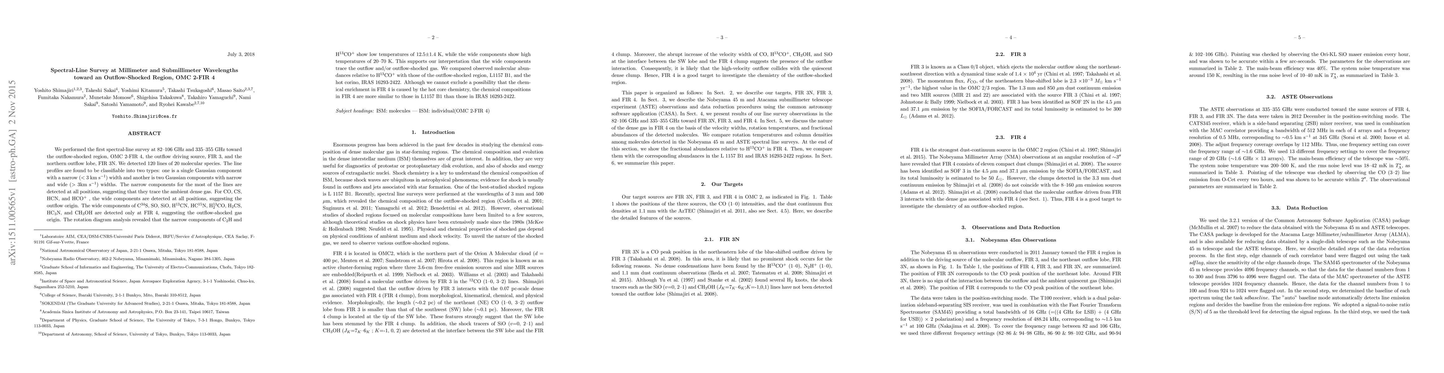 This study conducted a spectral-line survey at millimeter and submillimeter wavelengths toward OMC 2-FIR 4, detecting 120 lines of 20 molecular species. The detected lines are categorized into narrow and wide components, with the latter indicating outflow-shocked gas, while the former traces ambient dense gas.
