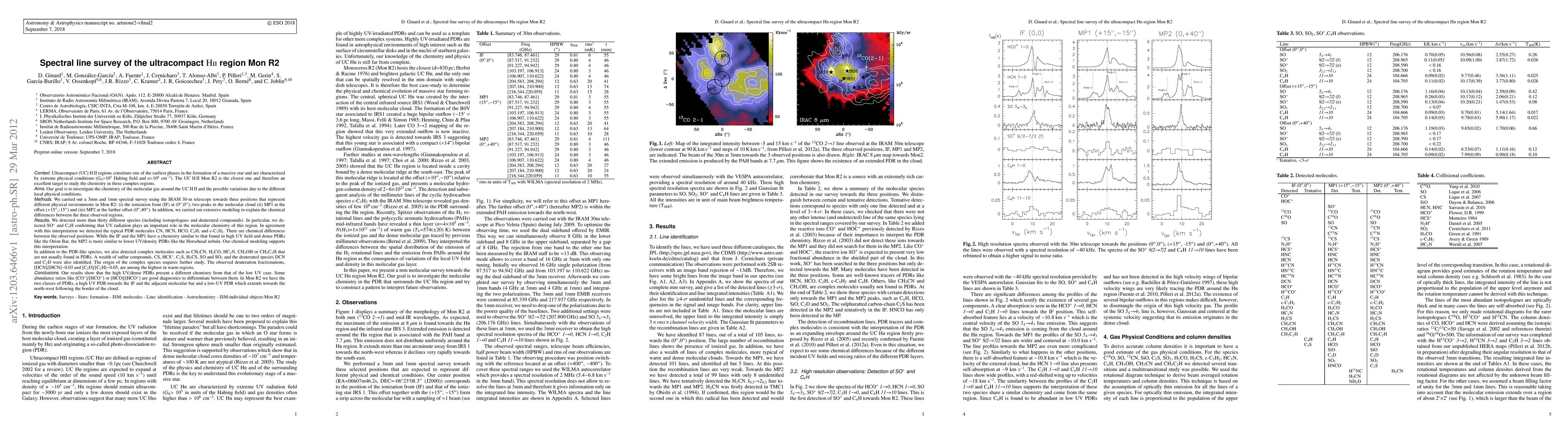 This study conducted a spectral line survey of the ultracompact HII region Mon R2 using the IRAM 30-m telescope, revealing diverse chemical compositions across different physical environments. The survey detected over thirty species, including complex molecules, indicating significant influence of UV radiation on molecular chemistry.