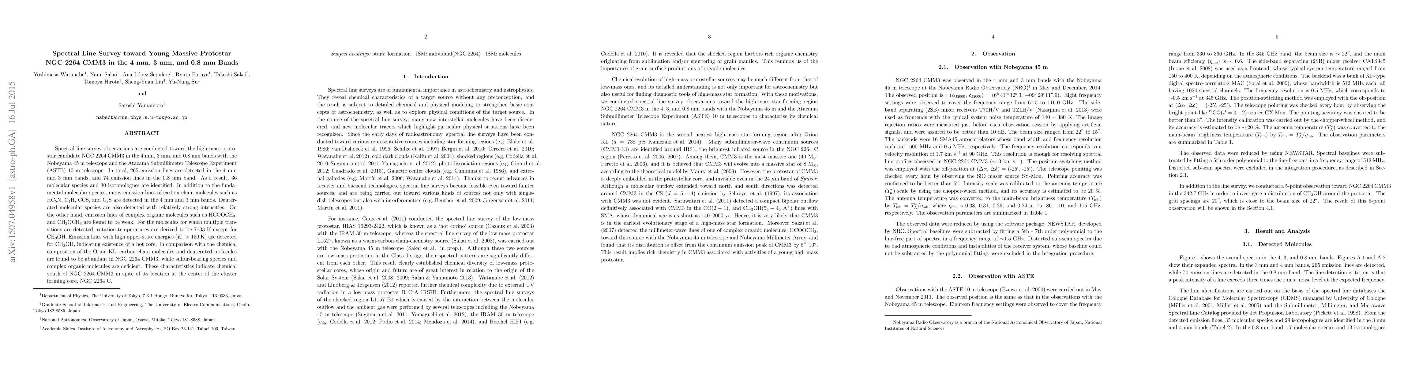 This paper reports a spectral line survey of the high-mass protostar NGC 2264 CMM3 using multiple submillimeter telescopes, detecting 265 and 74 emission lines in the 4 mm and 0.8 mm bands, respectively. The study identifies 36 molecular species and 30 isotopologues, highlighting the abundance of carbon-chain and deuterated molecules, while complex organic molecules are relatively weak.
