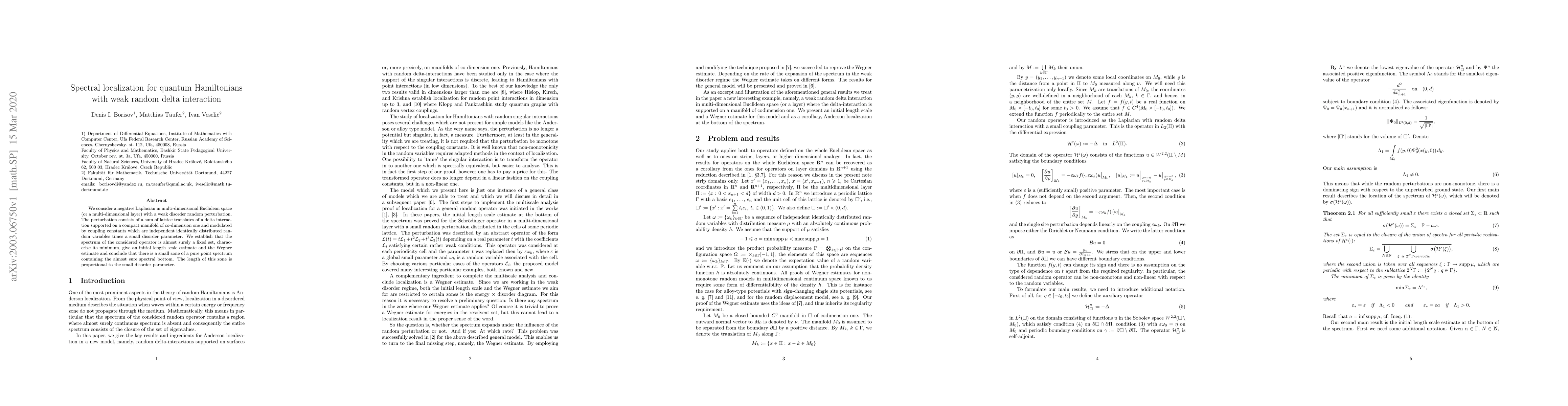 This research proves that the spectrum of a quantum Hamiltonian with weak random delta interactions on a multi-dimensional space is almost surely localized. It identifies the spectral minimum, provides a length scale estimate, and confirms a small pure point spectrum zone near the bottom, whose length is proportional to the disorder parameter.