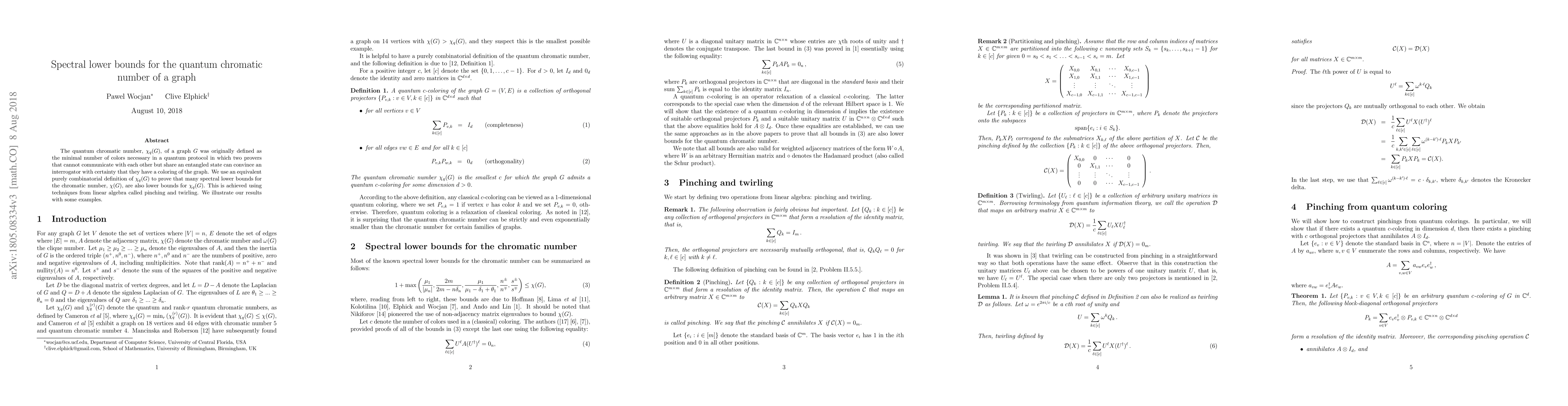 The quantum chromatic number, $\chi_q(G)$, of a graph $G$ was originally defined as the minimal number of colors necessary in a quantum protocol in which two provers that cannot communicate with each other but share an entangled state can convince an interrogator with certainty that they have a coloring of the graph. We use an equivalent purely combinatorial definition of $\chi_q(G)$ to prove that many spectral lower bounds for the chromatic number, $\chi(G)$, are also lower bounds for $\chi_q(G)$. This is achieved using techniques from linear algebra called pinching and twirling. We illustrate our results with some examples.